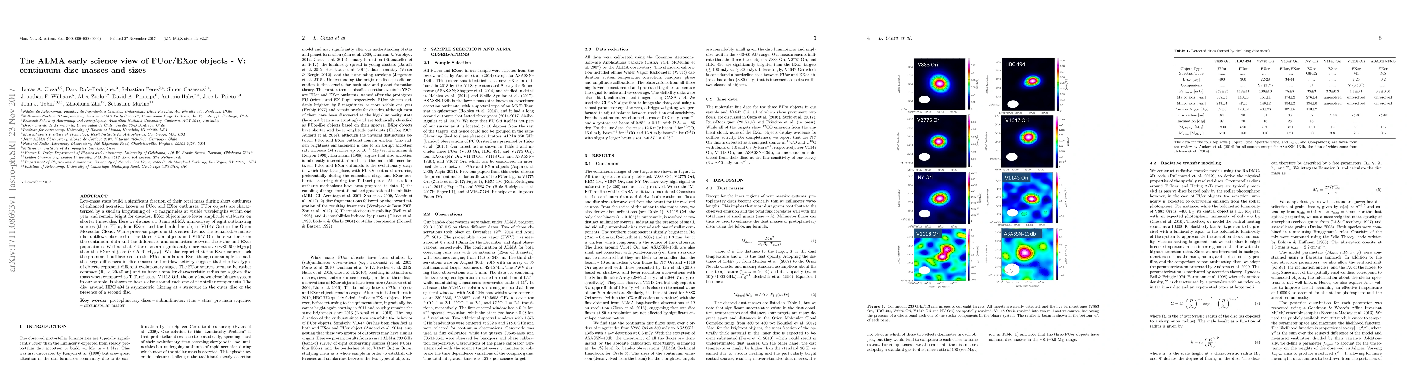 This study uses ALMA to analyze the continuum data of eight FUor and EXor objects in the Orion Molecular Cloud, finding that FUor discs are significantly more massive and compact than EXor discs, suggesting different evolutionary stages. The EXor objects lack the prominent outflows seen in FUor objects.