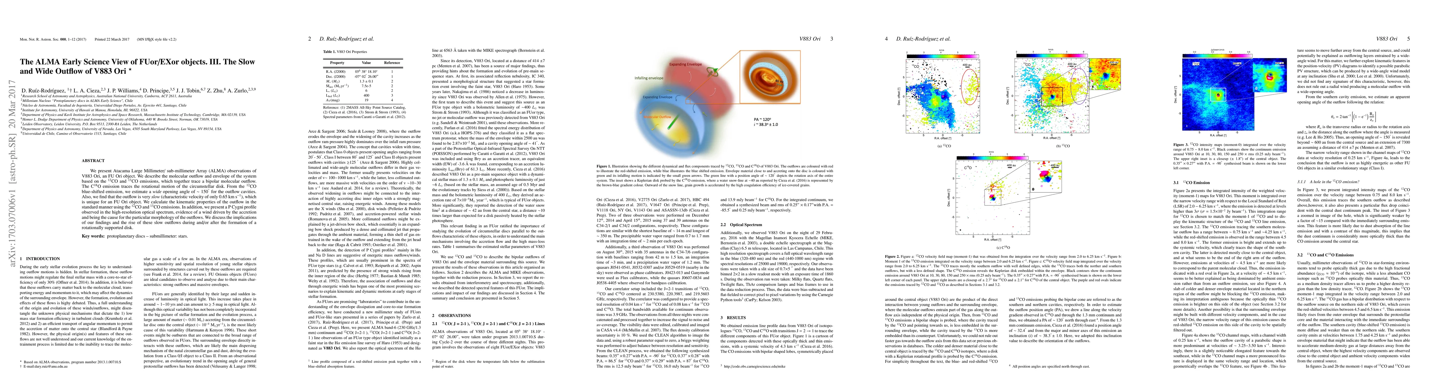 We present Atacama Large Millimeter/ sub-millimeter Array (ALMA) observations of V883 Ori, an FU Ori object. We describe the molecular outflow and envelope of the system based on the $^{12}$CO and $^{13}$CO emissions, which together trace a bipolar molecular outflow. The C$^{18}$O emission traces the rotational motion of the circumstellar disk. From the $^{12}$CO blue-shifted emission, we estimate a wide opening angle of $\sim$ 150$^{^{\circ}}$ for the outflow cavities. Also, we find that the outflow is very slow (characteristic velocity of only 0.65 km~s$^{-1}$), which is unique for an FU Ori object. We calculate the kinematic properties of the outflow in the standard manner using the $^{12}$CO and $^{13}$CO emissions. In addition, we present a P Cygni profile observed in the high-resolution optical spectrum, evidence of a wind driven by the accretion and being the cause for the particular morphology of the outflows. We discuss the implications of our findings and the rise of these slow outflows during and/or after the formation of a rotationally supported disk.