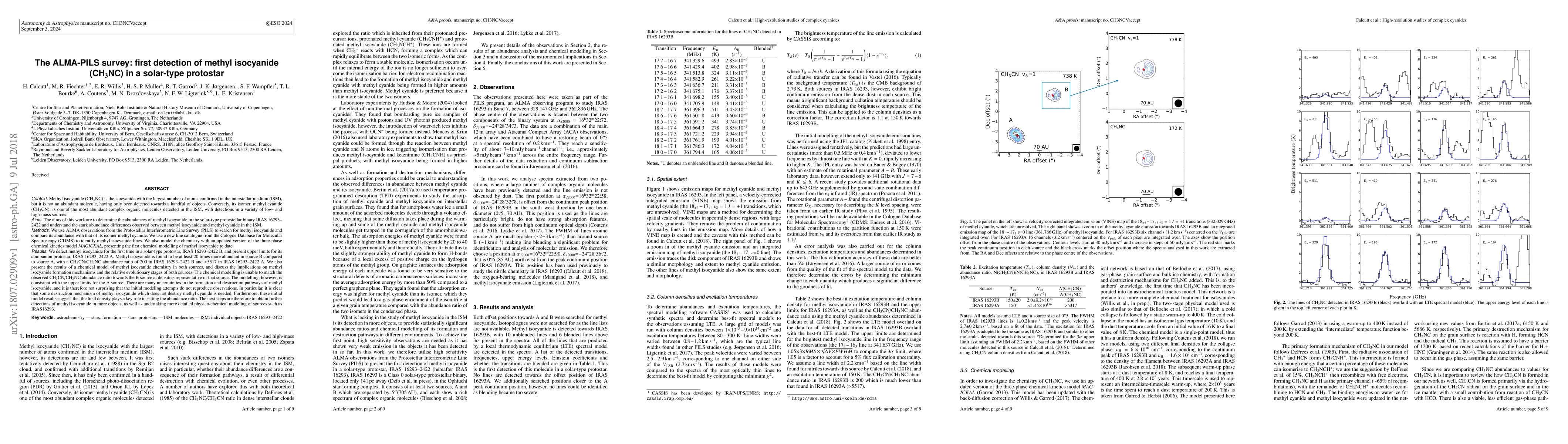 The ALMA-PILS survey detected methyl isocyanide (CH$_3$NC) for the first time in the solar-type protostar IRAS 16293-2422 B, revealing it to be at least 20 times more abundant than in its companion protostar IRAS 16293-2422 A. This discovery provides insights into the formation mechanisms of complex organic molecules in the interstellar medium.
