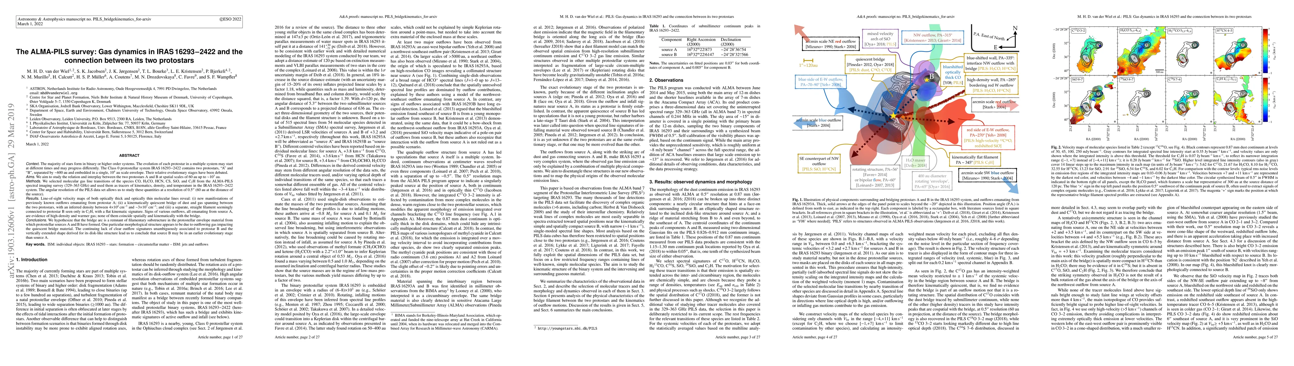 The ALMA-PILS survey reveals complex gas dynamics in the IRAS 16293-2422 protostellar system, showing outflows from protostar A and a quiescent bridge between the two protostars. The findings suggest protostar B may be in an earlier evolutionary stage than protostar A.