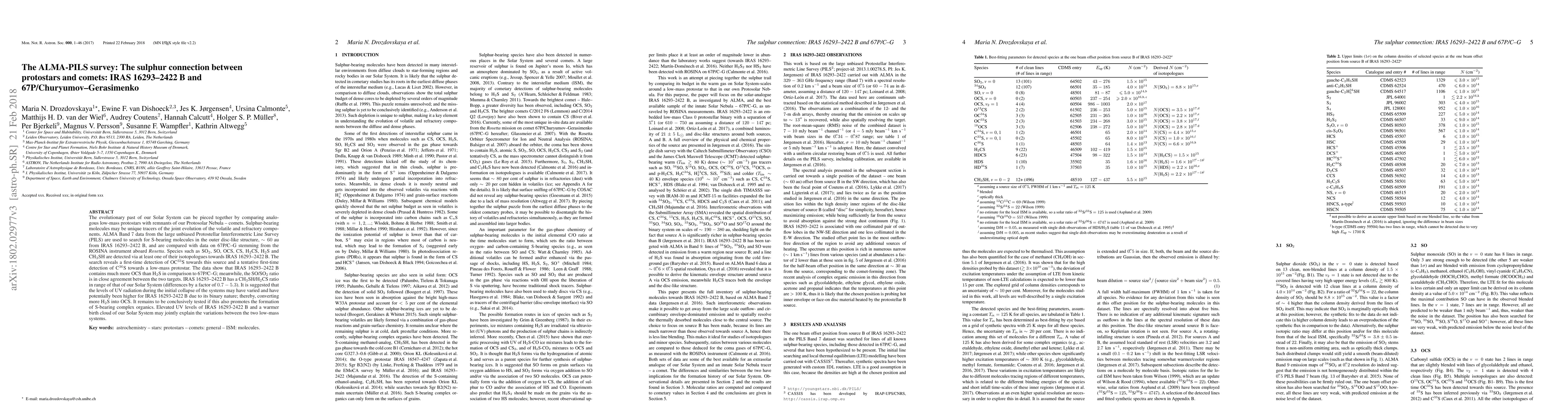 The ALMA-PILS survey identifies sulphur-bearing molecules in the protostar IRAS 16293-2422 B and compares them with those in comet 67P/Churyumov-Gerasimenko, suggesting that higher UV radiation levels in IRAS 16293-2422 B may convert more H$_2$S into OCS, potentially influencing the formation of complex organics.
