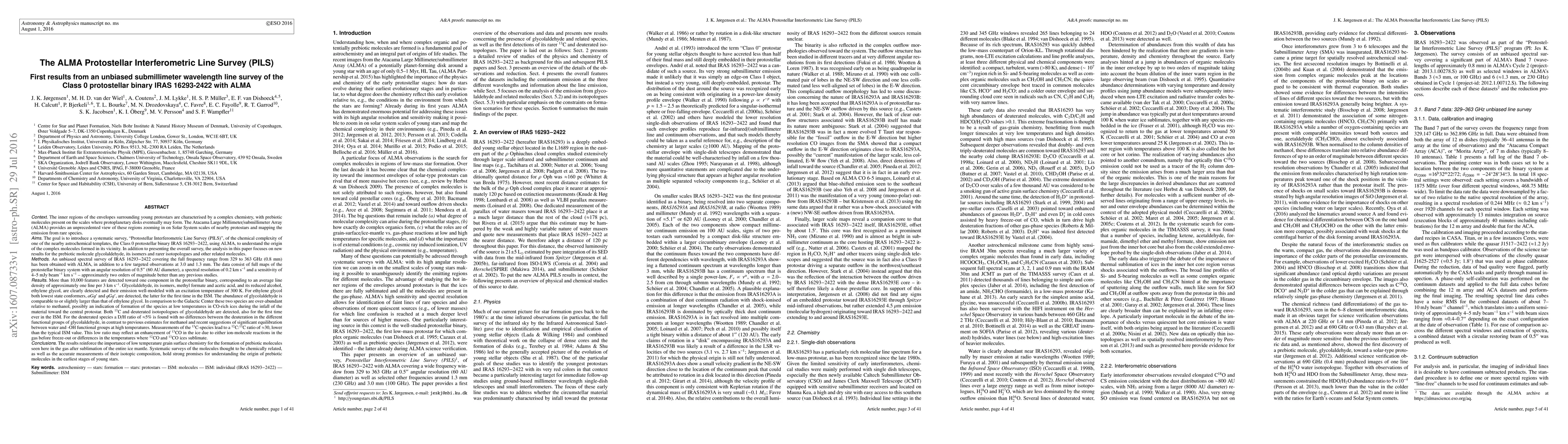 This paper presents the first results from the ALMA Protostellar Interferometric Line Survey (PILS) of the Class 0 protostellar binary IRAS 16293-2422, detecting over 10,000 features and identifying complex prebiotic molecules like glycolaldehyde and ethylene glycol. The study highlights the significance of low-temperature grain surface chemistry in forming these molecules, with notable detections of their isotopologues and a D/H ratio of approximately 5%.