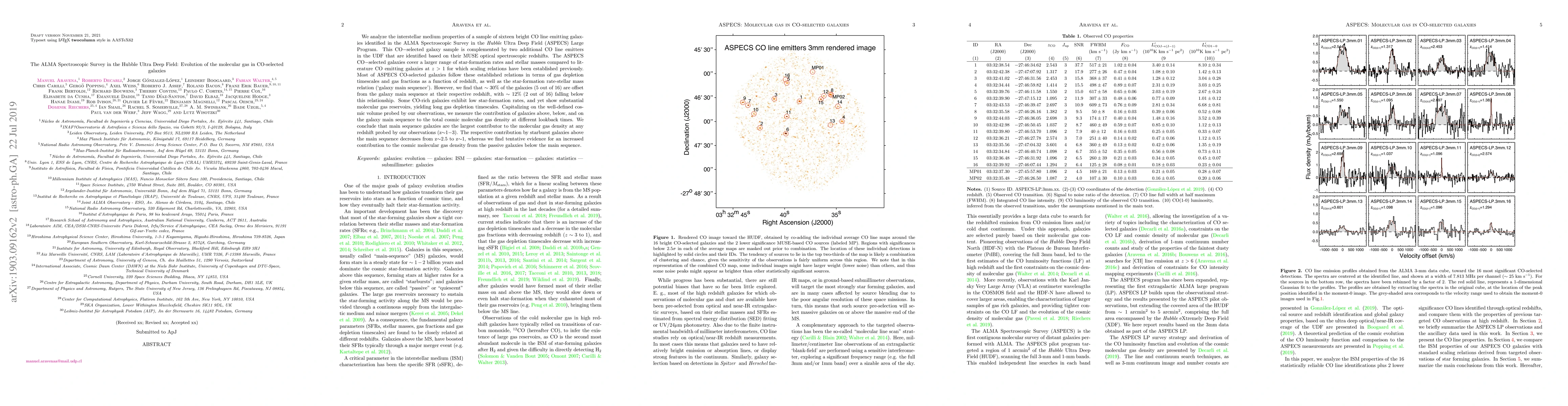 We analyze the interstellar medium properties of a sample of sixteen bright CO line emitting galaxies identified in the ALMA Spectroscopic Survey in the Hubble Ultra Deep Field (ASPECS) Large Program. This CO$-$selected galaxy sample is complemented by a couple of additional CO line emitters in the UDF that are identified based on their MUSE optical spectroscopic redshifts. The ASPECS CO$-$selected galaxies cover a larger range of star-formation rates and stellar masses compared to literature CO emitting galaxies at $z>1$ for which scaling relations have been established previously. Most of ASPECS CO-selected galaxies follow these established relations in terms of gas depletion timescales and gas fractions as a function of redshift, as well as the star-formation rate-stellar mass relation (`galaxy main sequence'). However, we find that $\sim30\%$ of the galaxies (5 out of 16) are offset from the galaxy main sequence at their respective redshift, with $\sim12\%$ (2 out of 16) falling below this relationship. Some CO-rich galaxies exhibit low star-formation rates, and yet show substantial molecular gas reservoirs, yielding long gas depletion timescales. Capitalizing on the well-defined cosmic volume probed by our observations, we measure the contribution of galaxies above, below, and on the galaxy main sequence to the total cosmic molecular gas density at different lookback times. We conclude that main sequence galaxies are the largest contributor to the molecular gas density at any redshift probed by our observations (z$\sim$1$-$3). The respective contribution by starburst galaxies above the main sequence decreases from z$\sim$2.5 to z$\sim$1, whereas we find tentative evidence for an increased contribution to the cosmic molecular gas density from the passive galaxies below the main sequence.