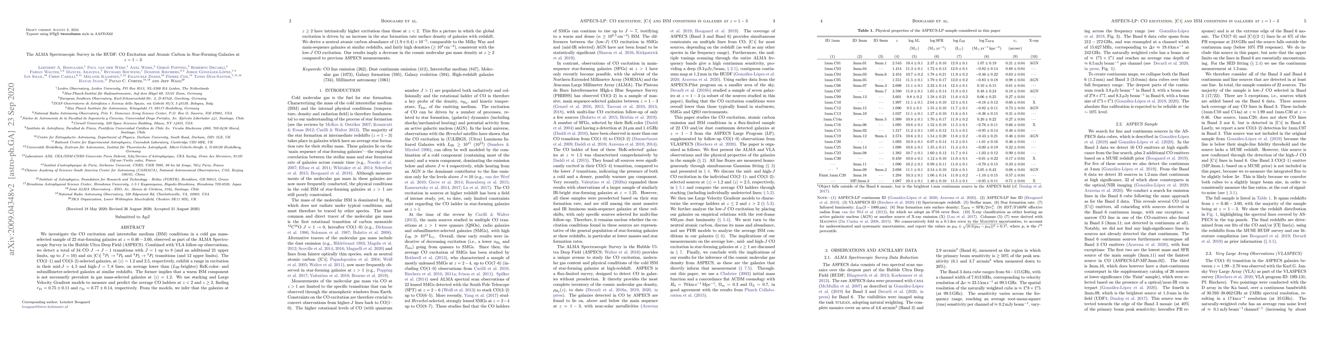 We investigate the CO excitation and interstellar medium (ISM) conditions in a cold gas mass-selected sample of 22 star-forming galaxies at $z=0.46-3.60$, observed as part of the ALMA Spectroscopic Survey in the Hubble Ultra Deep Field (ASPECS). Combined with VLA follow-up observations, we detect a total of 34 CO $J \rightarrow J-1$ transitions with $J=1$ up to $8$ (and an additional 21 upper limits, up to $J=10$) and six [C I] ${^3P}_1 \rightarrow {^3P}_0$ and ${^3P}_2 \rightarrow {^3P}_1$ transitions (and 12 upper limits). The CO(2-1) and CO(3-2)-selected galaxies, at $z=1.2$ and $2.5$, respectively, exhibit a range in excitation in their mid-$J=4,5$ and high-$J=7,8$ lines, on average lower than ($L_{\rm IR}$-brighter) BzK-color- and submillimeter-selected galaxies at similar redshifts. The former implies that a warm ISM component is not necessarily prevalent in gas mass-selected galaxies at $z=1.2$. We use stacking and Large Velocity Gradient models to measure and predict the average CO ladders at $z<2$ and $z\geq2$, finding $r_{21}=0.75 \pm 0.11$ and $r_{31}=0.77 \pm 0.14$, respectively. From the models, we infer that the galaxies at $z\geq2$ have intrinsically higher excitation than those at $z<2$. This fits a picture in which the global excitation is driven by an increase in the star formation rate surface density of galaxies with redshift. We derive a neutral atomic carbon abundance of $(1.9 \pm 0.4) \times 10^{-5}$, comparable to the Milky Way and main-sequence galaxies at similar redshifts, and fairly high densities ($\geq 10^4$ cm$^{-3}$), consistent with the low-$J$ CO excitation. Our results imply a decrease in the cosmic molecular gas mass density at $z\geq2$ compared to previous ASPECS measurements.