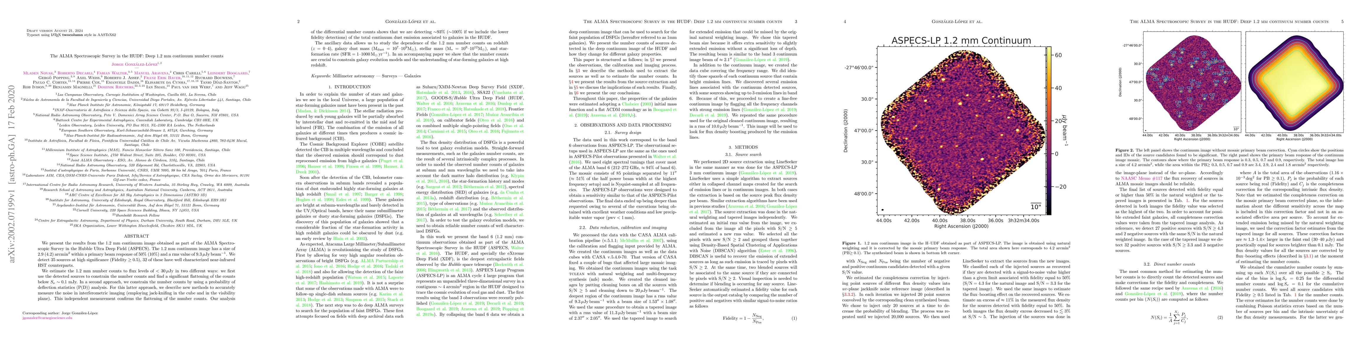 We present the results from the 1.2 mm continuum image obtained as part of the ALMA Spectroscopic Survey in the Hubble Ultra Deep Field (ASPECS). The 1.2 mm continuum image has a size of 2.9 (4.2) arcmin$^2$ within a primary beam response of 50% (10%) and a rms value of $9.3\thinspace{\rm\mu Jy\thinspace beam^{-1}}$. We detect 35 sources at high significance (Fidelity $\geq0.5$), 32 of these have well characterized near-infrared HST counterparts. We estimate the 1.2 mm number counts to flux levels of $<30\thinspace{\rm\mu Jy}$ in two different ways: we first use the detected sources to constrain the number counts and find a significant flattening of the counts below $S_\nu \sim 0.1$ mJy. In a second approach, we constrain the number counts by using a probability of deflection statistics (P(D)) analysis. For this latter approach, we describe new methods to accurately measure the noise in interferometric imaging (employing jack-knifing in the cube and in the visibility plane). This independent measurement confirms the flattening of the number counts. Our analysis of the differential number counts shows that we are detecting $\sim$93% ($\sim$100% if we include the lower fidelity detections) of the total continuum dust emission associated to galaxies in the HUDF. The ancillary data allows us to study the dependence of the 1.2 mm number counts on redshift ($z=0-4$), galaxy dust mass (${\rm M}_{\rm dust}=10^{7}-10^{9}{\rm M}_{\odot}$), stellar mass (${\rm M}_{*}=10^{9}-10^{12}{\rm M}_{\odot}$), and star-formation rate (${\rm SFR}=1-1000\thinspace{\rm M}_{\odot}\thinspace{\rm yr^{-1}}$). In an accompanying paper we show that the number counts are crucial to constrain galaxy evolution models and the understanding of star-forming galaxies at high redshift.