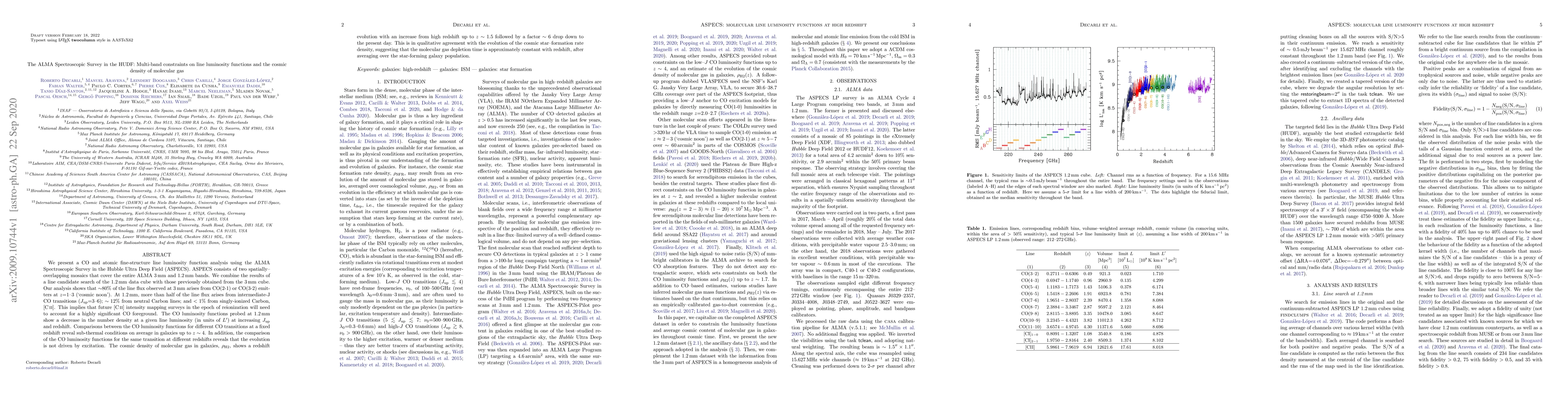 This paper uses ALMA data from the ASPECS survey to analyze CO and atomic fine-structure line luminosity functions in the HUDF, revealing that CO transitions dominate line flux at 3mm and 1.2mm, with significant CO foregrounds for future [CII] surveys. The study also finds a redshift-dependent evolution in the cosmic density of molecular gas, aligning with the cosmic star-formation rate density.