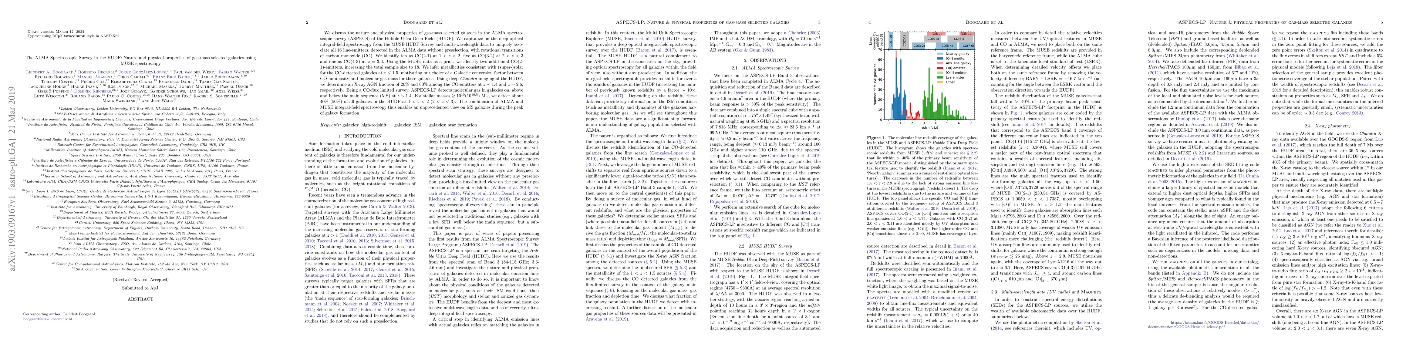This paper explores the nature and physical properties of gas-mass selected galaxies in the ALMA Spectroscopic Survey (ASPECS) of the Hubble Ultra Deep Field (HUDF), using MUSE spectroscopy. It identifies 18 CO-emitting galaxies, revealing metallicities consistent with (super-)solar and an X-ray AGN fraction, while showing molecular gas presence across the main sequence of star-forming galaxies at $z \sim 1.4$.