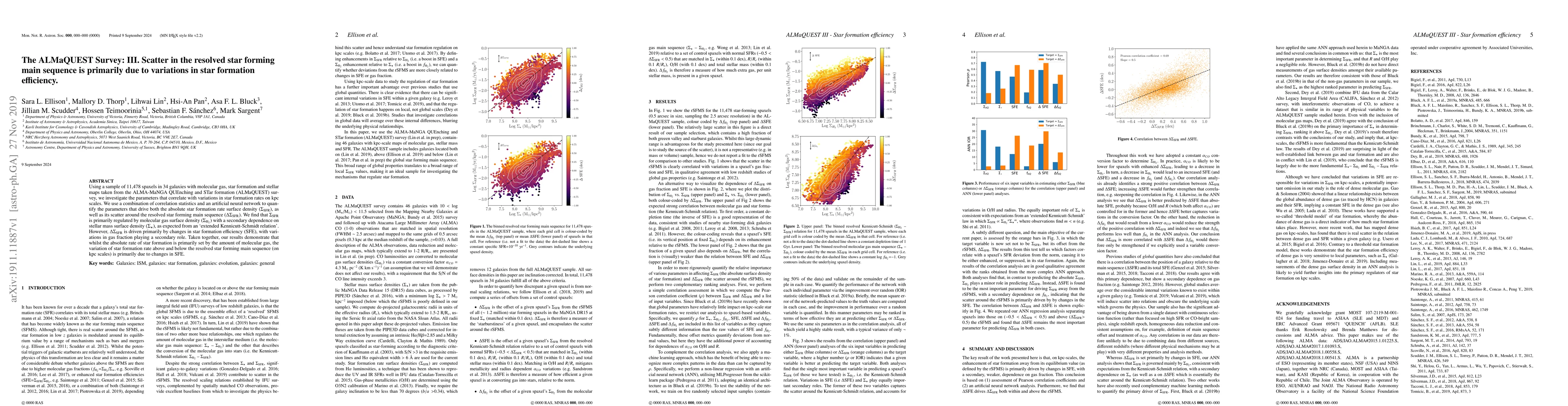 This study from the ALMaQUEST survey reveals that the absolute star formation rate in galaxies correlates with molecular gas and stellar mass, following an extended Kennicutt-Schmidt relation. The scatter in star formation rates around the main sequence is primarily driven by variations in star formation efficiency, with gas fraction having a secondary influence.