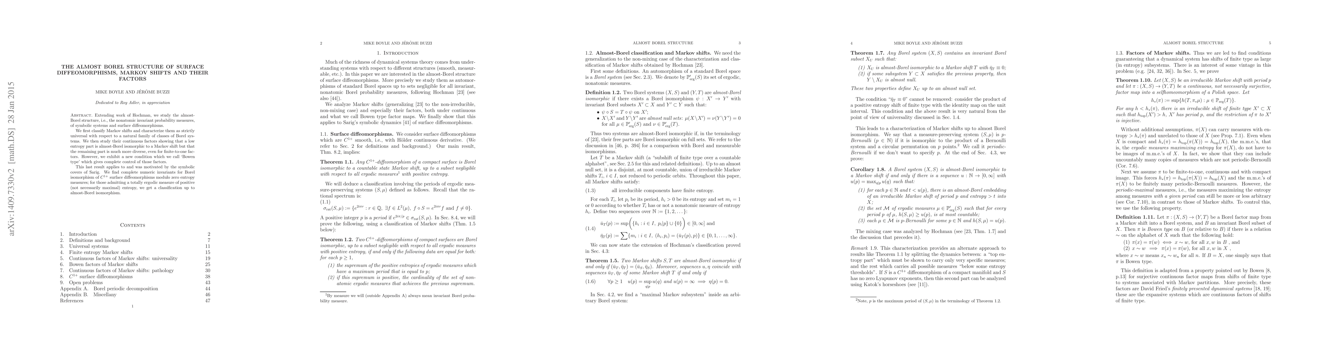 Extending work of Hochman, we study the almost-Borel structure, i.e., the nonatomic invariant probability measures, of symbolic systems and surface diffeomorphisms. We first classify Markov shifts and characterize them as strictly universal with respect to a natural family of classes of Borel systems. We then study their continuous factors showing that a low entropy part is almost-Borel isomorphic to a Markov shift but that the remaining part is much more diverse, even for finite-to-one factors. However, we exhibit a new condition which we call "Bowen type" which gives complete control of those factors. This last result applies to and was motivated by the symbolic covers of Sarig. We find complete numeric invariants for Borel isomorphism of $C^{1+}$ surface diffeomorphisms modulo zero entropy measures; for those admitting a totally ergodic measure of positive (not necessarily maximal) entropy, we get a classification up to almost-Borel isomorphism.