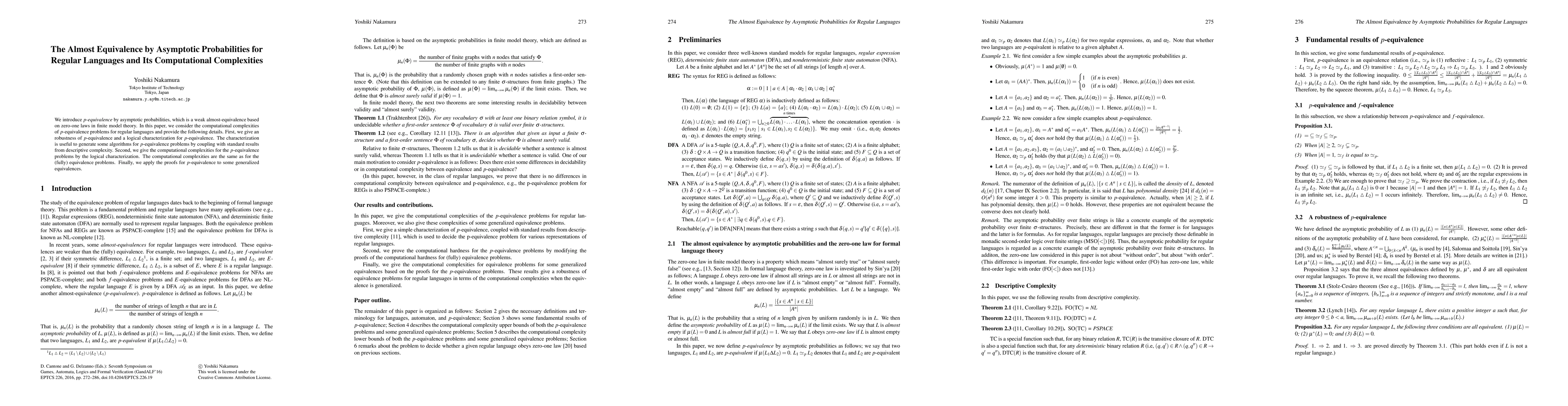 We introduce p-equivalence by asymptotic probabilities, which is a weak almost-equivalence based on zero-one laws in finite model theory. In this paper, we consider the computational complexities of p-equivalence problems for regular languages and provide the following details. First, we give an robustness of p-equivalence and a logical characterization for p-equivalence. The characterization is useful to generate some algorithms for p-equivalence problems by coupling with standard results from descriptive complexity. Second, we give the computational complexities for the p-equivalence problems by the logical characterization. The computational complexities are the same as for the (fully) equivalence problems. Finally, we apply the proofs for p-equivalence to some generalized equivalences.