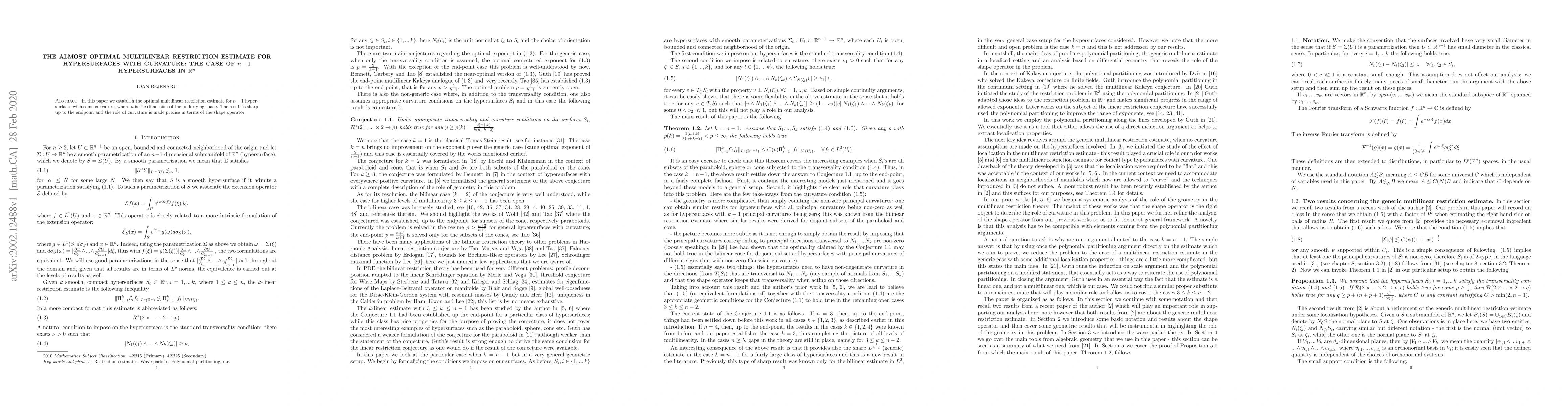 In this paper we establish the optimal multilinear restriction estimate for n-1 hypersurfaces with some curvature, where $n$ is the dimension of the underlying space. The result is sharp up to the endpoint and the role of curvature is made precise in terms of the shape operator.