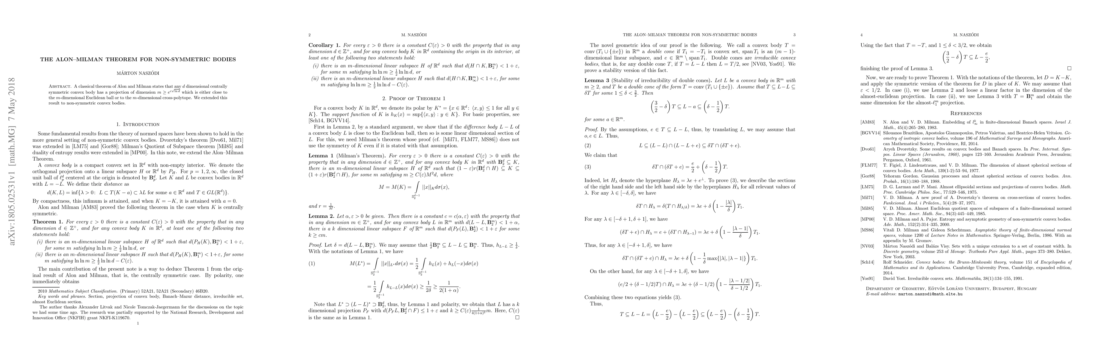 The Alon--Milman Theorem, originally for centrally symmetric convex bodies, has been extended to non-symmetric convex bodies, showing that any $d$-dimensional convex body still has a projection of dimension $m \geq e^{c\sqrt{\ln{d}}}$ that is close to the $m$-dimensional Euclidean ball or cross-polytope.