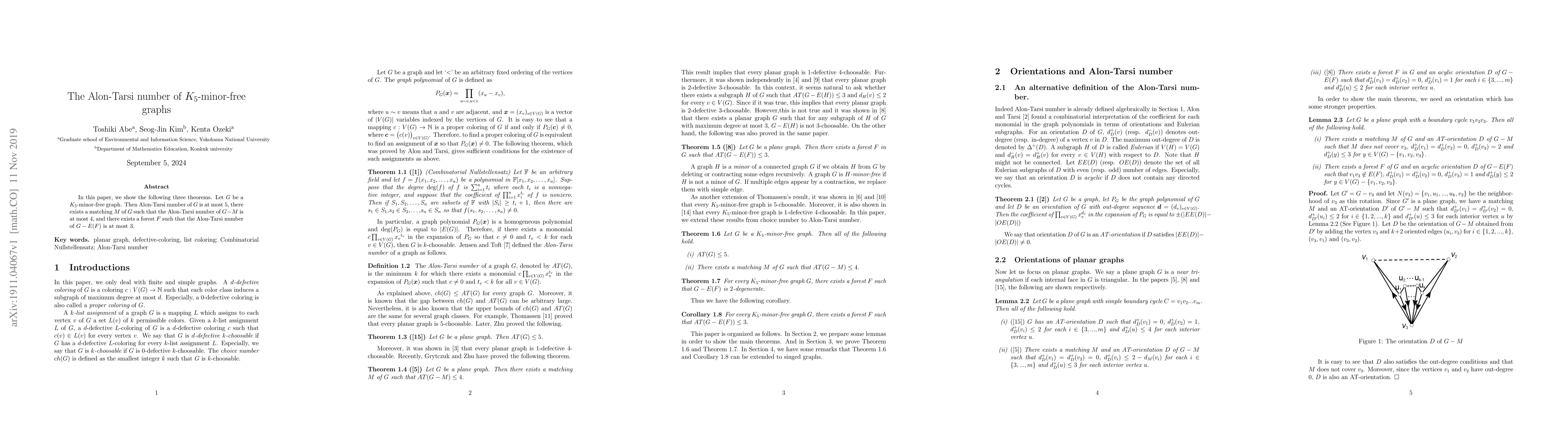 Summary: This paper establishes upper bounds for the Alon-Tarsi number in $K_5$-minor-free graphs, proving that it does not exceed $5$ overall, can be reduced to $4$ by removing a specific matching, and further reduced to $3$ by removing edges from a particular forest.
