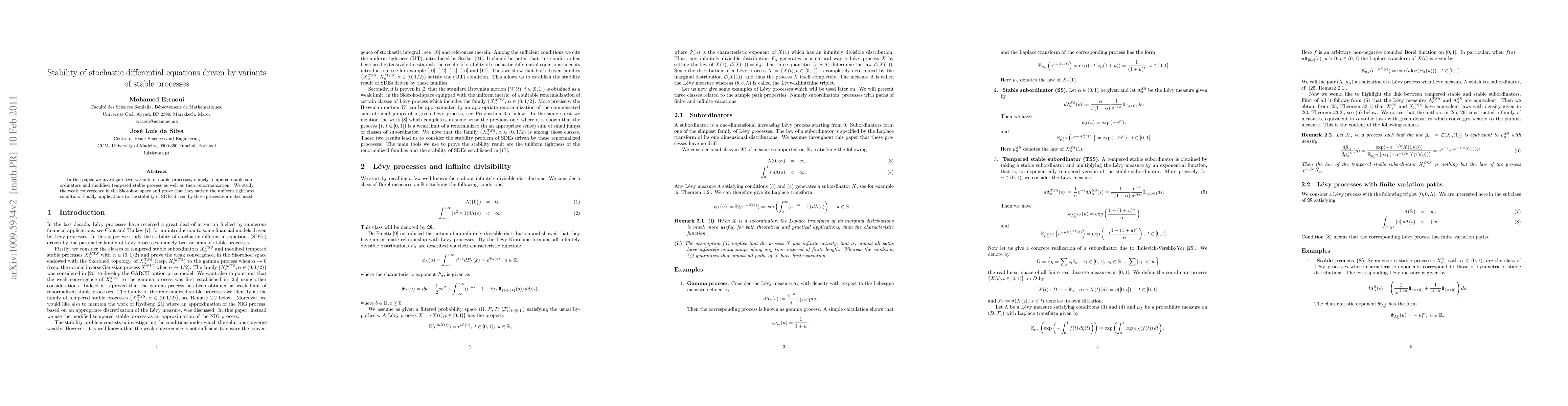 This paper examines two variants of $\alpha$-stable processes—tempered stable subordinators and modified tempered stable processes—and their renormalization. It proves their weak convergence in the Skorohod space and discusses applications to $\alpha$-dependence in stochastic differential equations driven by these processes.