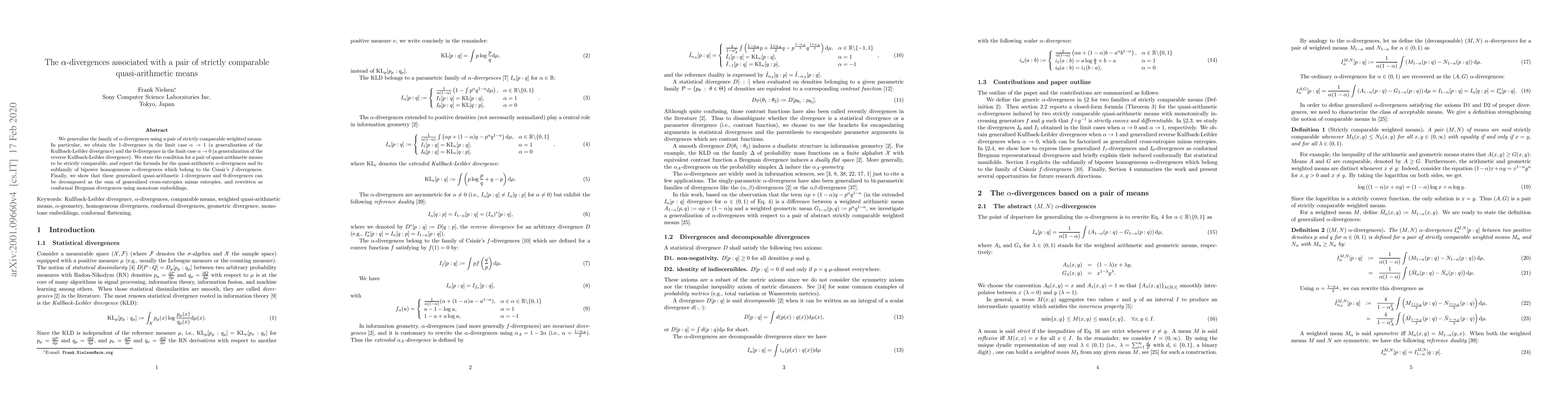 This paper generalizes $\alpha$-divergences through strictly comparable quasi-arithmetic means, deriving the $1$-divergence and $0$-divergence limits, and provides conditions for strict comparability. It also presents the formula for quasi-arithmetic $\alpha$-divergences and their decomposition as conformal Bregman divergences.
