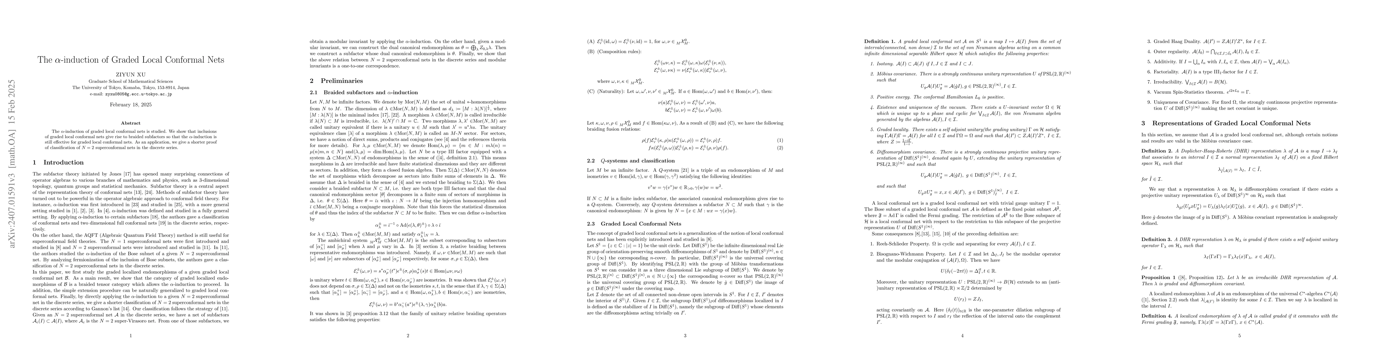 This paper explores $\alpha$-induction applied to graded local conformal nets, demonstrating that such inclusions yield braided subfactors and proving $\alpha$-induction's continued validity. It provides a shorter proof for classifying $N=2$ superconformal nets in the discrete series.