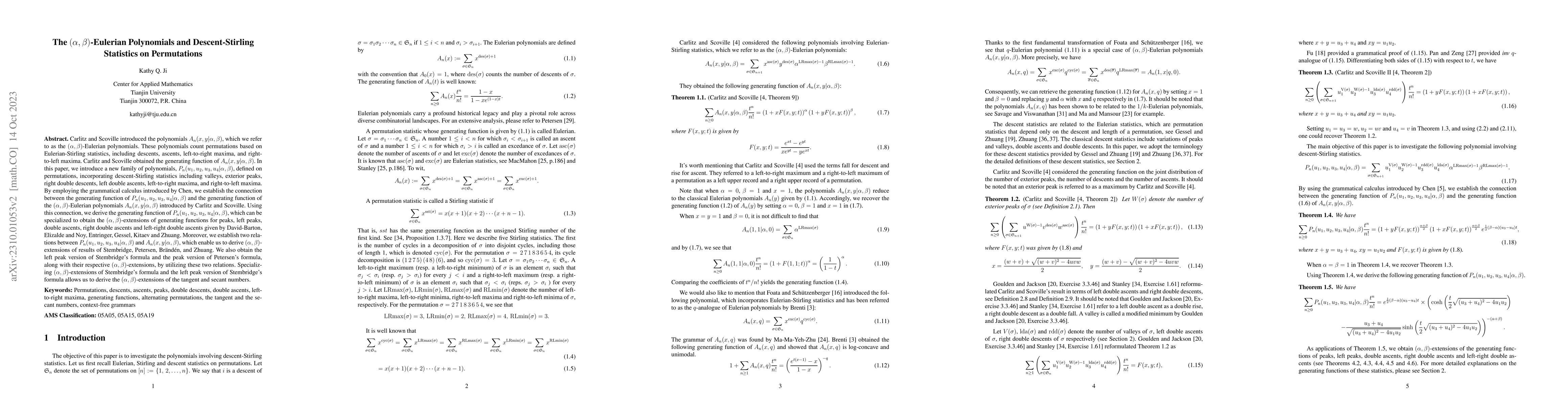 Carlitz and Scoville introduced the polynomials $A_n(x,y|{\alpha},{\beta})$, which we refer to as the $(\alpha, \beta)$-Eulerian polynomials. These polynomials count permutations based on Eulerian-Stirling statistics, including descents, ascents, left-to-right maxima, and right-to-left maxima. Carlitz and Scoville obtained the generating function of $A_n(x,y|{\alpha},{\beta})$. In this paper, we introduce a new family of polynomials, $P_n(u_1,u_2,u_3,u_4|{\alpha},{\beta})$, defined on permutations, incorporating descent-Stirling statistics including valleys, exterior peaks, right double descents, left double ascents, left-to-right maxima, and right-to-left maxima. By employing the grammatical calculus introduced by Chen, we establish the connection between the generating function of $P_n(u_1,u_2,u_3,u_4|{\alpha},{\beta})$ and the generating function of the $(\alpha,\beta)$-Eulerian polynomials $A_n(x,y|{\alpha},{\beta})$ introduced by Carlitz and Scoville. Using this connection, we derive the generating function of $P_n(u_1,u_2,u_3,u_4|{\alpha},{\beta})$, which can be specialized to obtain the $(\alpha,\beta)$-extensions of generating functions for peaks, left peaks, double ascents, right double ascents and left-right double ascents given by David-Barton, Elizalde and Noy, Entringer, Gessel, Kitaev and Zhuang. Moreover, we establish two relations between $P_n(u_1,u_2,u_3,u_4|{\alpha},{\beta})$ and $A_n(x,y|{\alpha},{\beta})$, which enable us to derive $(\alpha,\beta)$-extensions of results of Stembridge, Petersen, Br\"and\'en, and Zhuang. Specializing $(\alpha,\beta)$-extensions of Stembridge's formula and the left peak version of Stembridge's formula allows us to derive the $(\alpha,\beta)$-extensions of the tangent and secant numbers.