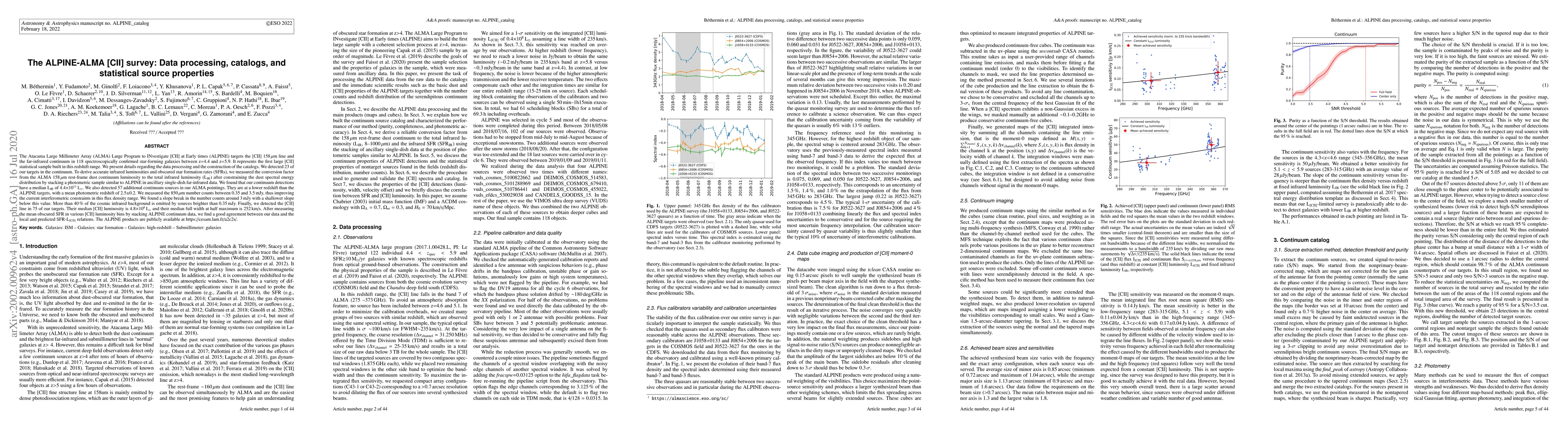 The ALPINE-ALMA large program targets the [CII] 158 $\mu$m line and the far-infrared continuum in 118 spectroscopically confirmed star-forming galaxies between z=4.4 and z=5.9. It represents the first large [CII] statistical sample built in this redshift range. We present details of the data processing and the construction of the catalogs. We detected 23 of our targets in the continuum. To derive accurate infrared luminosities and obscured star formation rates, we measured the conversion factor from the ALMA 158 $\mu$m rest-frame dust continuum luminosity to the total infrared luminosity (L$_{\rm IR}$) after constraining the dust spectral energy distribution by stacking a photometric sample similar to ALPINE in ancillary single-dish far-infrared data. We found that our continuum detections have a median L$_{\rm IR}$ of 4.4$\times 10^{11}$ L$_\odot$. We also detected 57 additional continuum sources in our ALMA pointings. They are at lower redshift than the ALPINE targets, with a mean photometric redshift of 2.5$\pm$0.2. We measured the 850 $\mu$m number counts between 0.35 and 3.5 mJy, improving the current interferometric constraints in this flux density range. We found a slope break in the number counts around 3 mJy with a shallower slope below this value. More than 40 % of the cosmic infrared background is emitted by sources brighter than 0.35 mJy. Finally, we detected the [CII] line in 75 of our targets. Their median [CII] luminosity is 4.8$\times$10$^8$ L$_\odot$ and their median full width at half maximum is 252 km/s. After measuring the mean obscured SFR in various [CII] luminosity bins by stacking ALPINE continuum data, we find a good agreement between our data and the local and predicted SFR-L$_{\rm [CII]}$ relations of De Looze et al. (2014) and Lagache et al. (2018).
