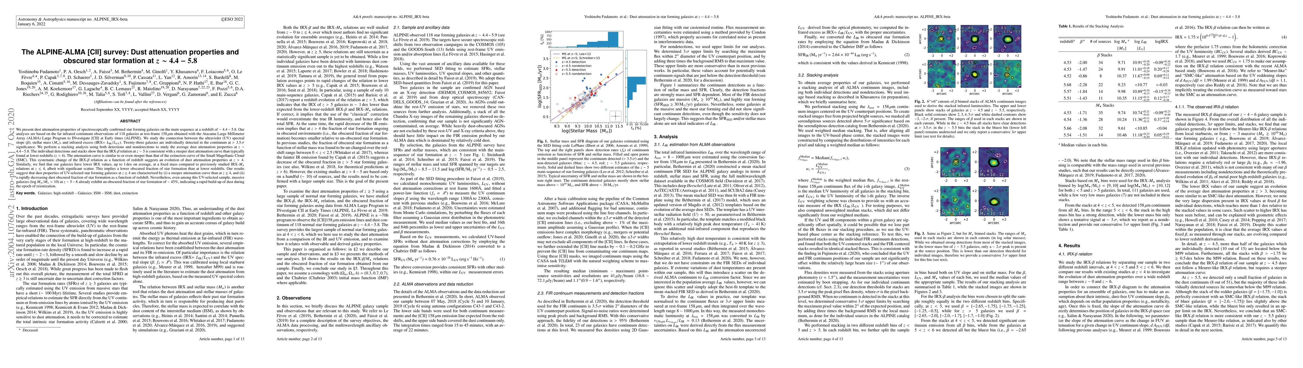The research utilized far-infrared continuum observations from the Atacama Large Millimeter Array (ALMA) Large Program to INvestigate [CII] at Early times (ALPINE), focusing on 118 galaxies at redshifts ~4.4-5.8. It analyzed the connection between the UV spectral slope ($\beta$), stellar mass (M_*), and infrared excess (IRX=L_IR/L_UV) to study dust attenuation properties.