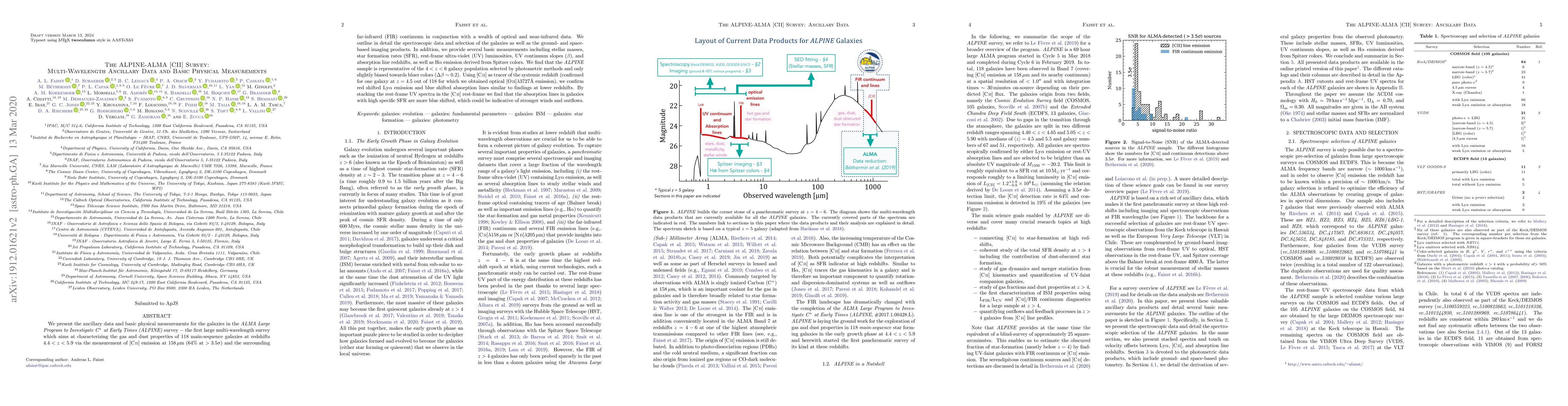 We present the ancillary data and basic physical measurements for the galaxies in the ALMA Large Program to Investigate C+ at Early Times (ALPINE) survey - the first large multi-wavelength survey which aims at characterizing the gas and dust properties of 118 main-sequence galaxies at redshifts 4.4 < z < 5.9 via the measurement of [CII]-emission at 158 micro-meter (64% at >3.5$\sigma$) and the surrounding far-infrared (FIR) continuum in conjunction with a wealth of optical and near-infrared data. We outline in detail the spectroscopic data and selection of the galaxies as well as the ground- and space-based imaging products. In addition, we provide several basic measurements including stellar masses, star formation rates (SFR), rest-frame ultra-violet (UV) luminosities, UV continuum slopes ($\beta$), and absorption line redshifts, as well as H-alpha emission derived from Spitzer colors. We find that the ALPINE sample is representative of the 4 < z < 6 galaxy population selected by photometric methods and only slightly biased towards bluer colors ($\Delta\beta$ ~ 0.2). Using [CII] as tracer of the systemic redshift (confirmed for one galaxy at z=4.5 out of 118 for which we obtained optical [OII]$\lambda$3727A emission), we confirm red shifted Ly-alpha emission and blue shifted absorption lines similar to findings at lower redshifts. By stacking the rest-frame UV spectra in the [CII] rest-frame we find that the absorption lines in galaxies with high specific SFR are more blue shifted, which could be indicative of stronger winds and outflows.