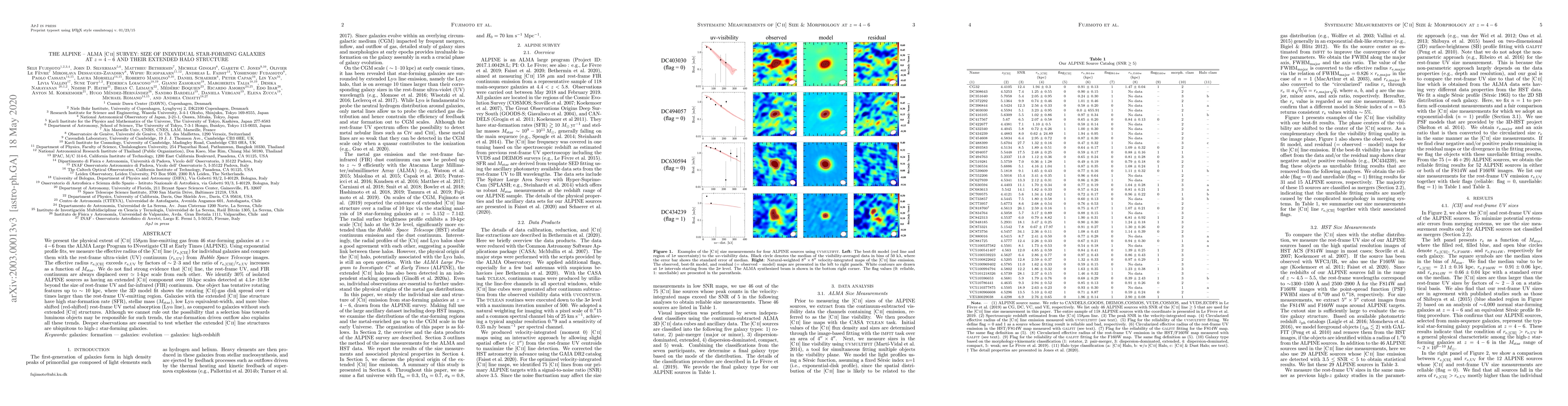 The ALPINE-ALMA survey reveals that star-forming galaxies at z=4-6 have [CII] line-emitting gas extending beyond their rest-frame UV continuum, with the ratio of [CII] to UV effective radii increasing with stellar mass. Extended [CII] structures are found in 30% of galaxies, suggesting star-formation driven outflows.