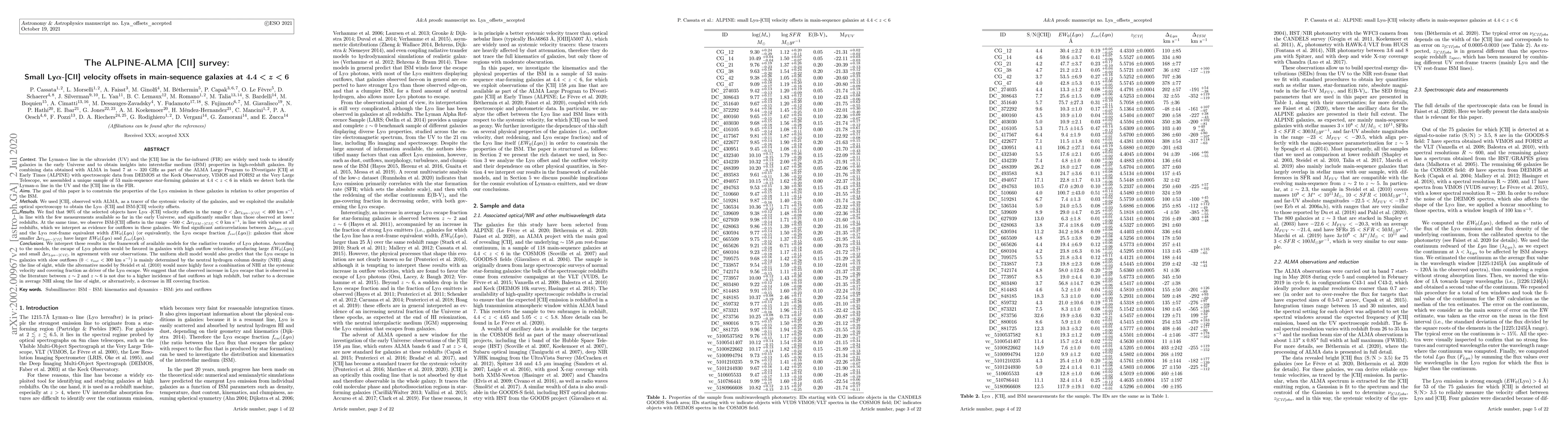 The ALPINE-ALMA survey finds small Lya-[CII] velocity offsets (<400 km/s) in main-sequence galaxies at redshifts 4.4 < z < 6, indicating minimal systemic differences between Lya and [CII] line emissions. The observed anticorrelation between these offsets and Lya escape fraction suggests that Lya photon escape is more influenced by neutral hydrogen column density and covering fraction than by outflow velocities.