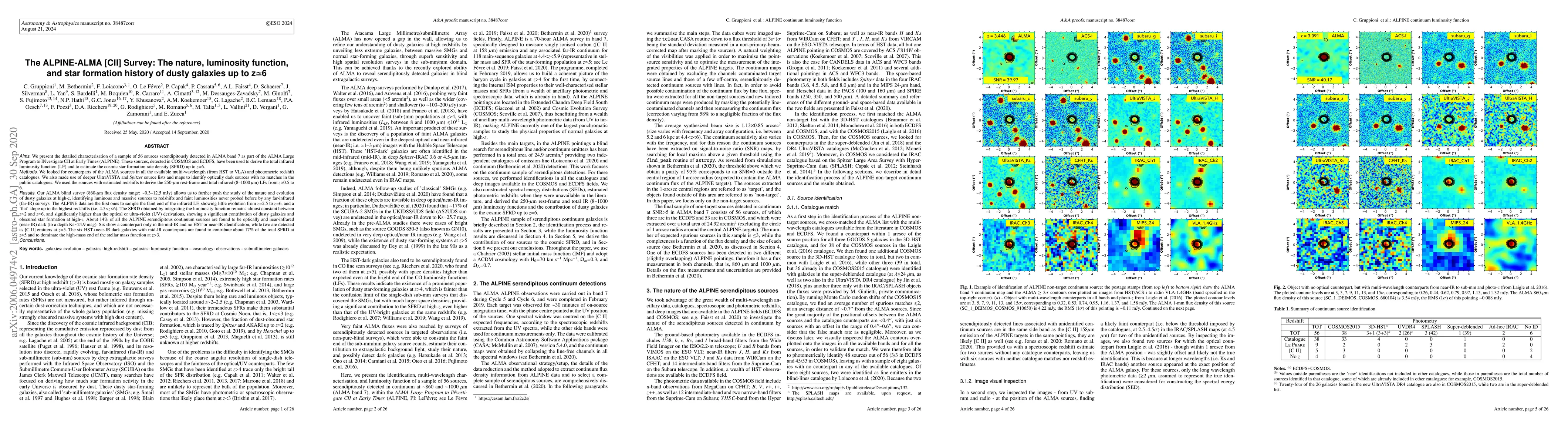 The ALPINE-ALMA survey characterizes a sample of 56 high-redshift dusty galaxies up to z~6, revealing a stable infrared luminosity function and constant star formation rate density from z=2 to z=6. The study identifies optically dark galaxies, indicating a significant contribution of obscured star formation.