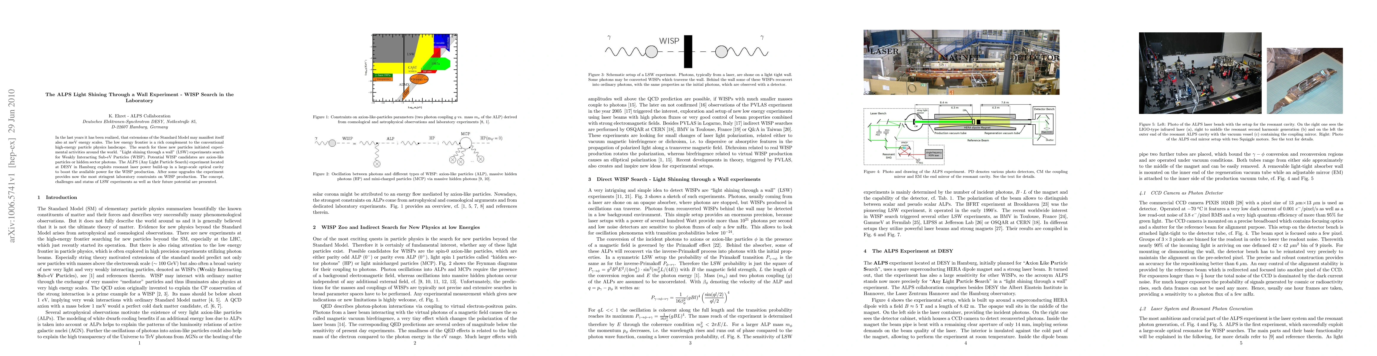 The ALPS experiment at DESY aims to detect Weakly Interacting Sub-eV Particles (WISP) like axion-like particles or hidden sector photons using a "light shining through a wall" technique. After upgrades, it now sets the most stringent laboratory constraints on WISP production.