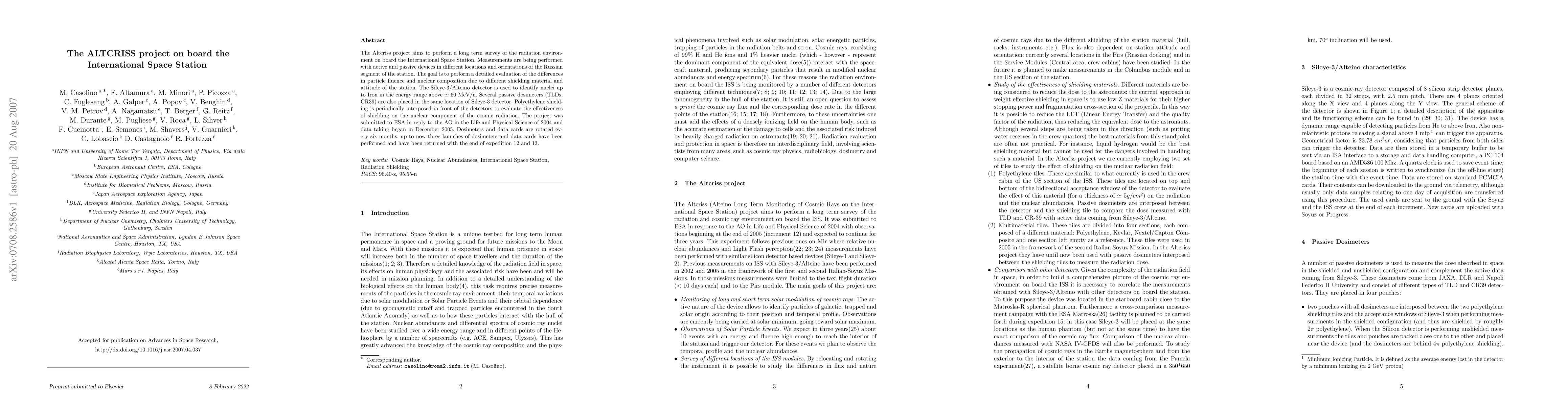 The ALTCRISS project on the International Space Station conducts a long-term survey of radiation environments using active and passive detectors, aiming to evaluate differences in particle fluence and nuclear composition due to shielding and station attitude. Data collection began in 2005, with periodic rotations of dosimeters and data cards.