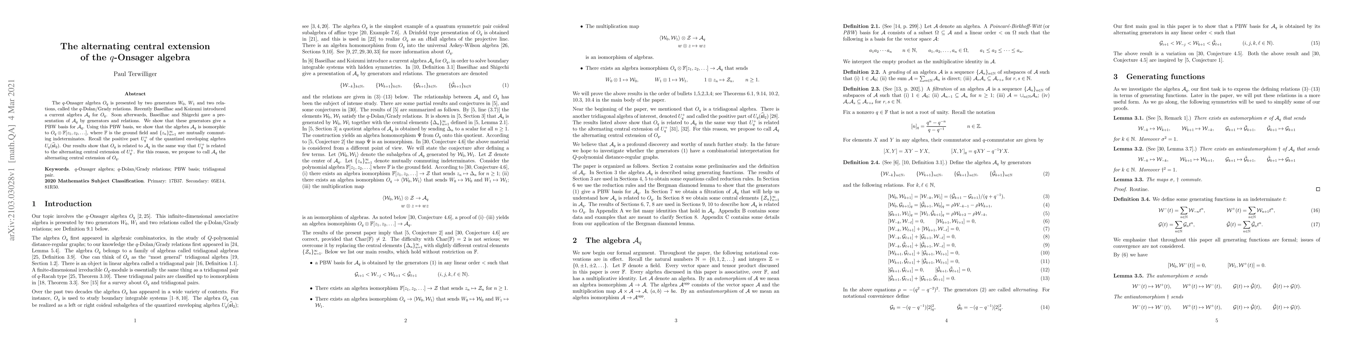 The $q$-Onsager algebra $O_q$ is presented by two generators $W_0$, $W_1$ and two relations, called the $q$-Dolan/Grady relations. Recently Baseilhac and Koizumi introduced a current algebra $\mathcal A_q$ for $O_q$. Soon afterwards, Baseilhac and Shigechi gave a presentation of $\mathcal A_q$ by generators and relations. We show that these generators give a PBW basis for $\mathcal A_q$. Using this PBW basis, we show that the algebra $\mathcal A_q$ is isomorphic to $O_q \otimes \mathbb F \lbrack z_1, z_2, \ldots \rbrack$, where $\mathbb F$ is the ground field and $\lbrace z_n \rbrace_{n=1}^\infty $ are mutually commuting indeterminates. Recall the positive part $U^+_q$ of the quantized enveloping algebra $U_q(\widehat{\mathfrak{sl}}_2)$. Our results show that $O_q$ is related to $\mathcal A_q$ in the same way that $U^+_q$ is related to the alternating central extension of $U^+_q$. For this reason, we propose to call $\mathcal A_q$ the alternating central extension of $O_q$.
