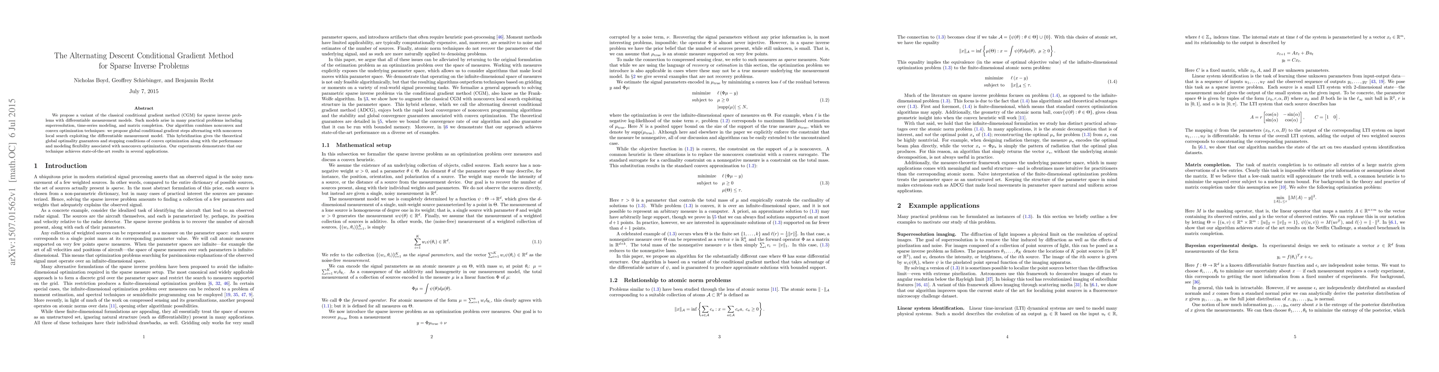 The paper introduces an alternating descent conditional gradient method for sparse inverse problems, combining global conditional gradient steps with nonconvex local search to achieve global optimality guarantees and state-of-the-art results in applications like superresolution and matrix completion.