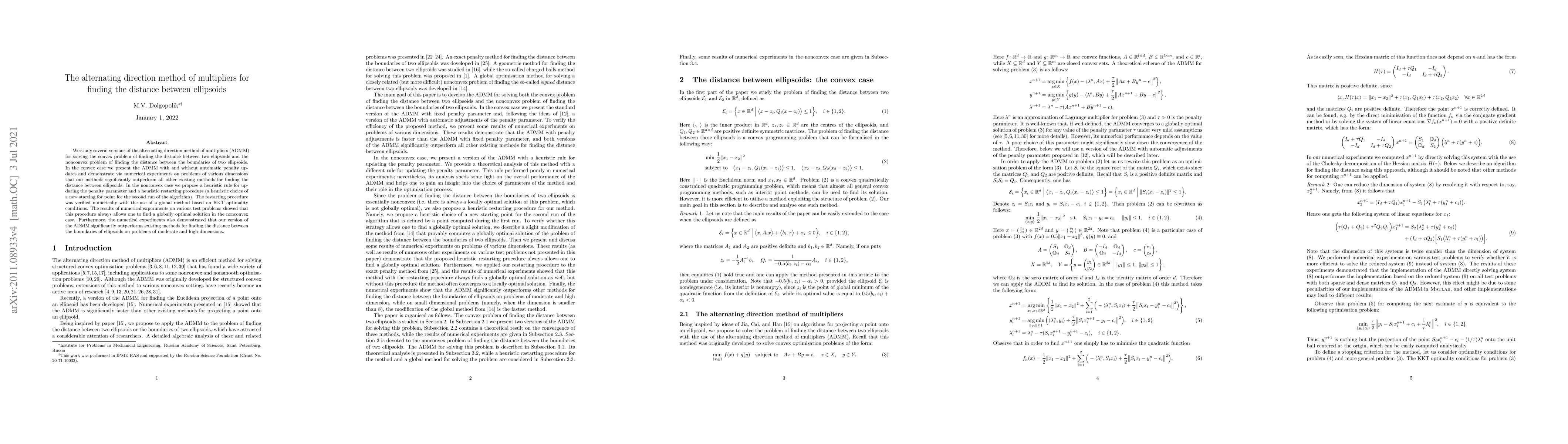 We study several versions of the alternating direction method of multipliers (ADMM) for solving the convex problem of finding the distance between two ellipsoids and the nonconvex problem of finding the distance between the boundaries of two ellipsoids. In the convex case we present the ADMM with and without automatic penalty updates and demonstrate via numerical experiments on problems of various dimensions that our methods significantly outperform all other existing methods for finding the distance between ellipsoids. In the nonconvex case we propose a heuristic rule for updating the penalty parameter and a heuristic restarting procedure (a heuristic choice of a new starting for point for the second run of the algorithm). The restarting procedure was verified numerically with the use of a global method based on KKT optimality conditions. The results of numerical experiments on various test problems showed that this procedure always allows one to find a globally optimal solution in the nonconvex case. Furthermore, the numerical experiments also demonstrated that our version of the ADMM significantly outperforms existing methods for finding the distance between the boundaries of ellipsoids on problems of moderate and high dimensions.