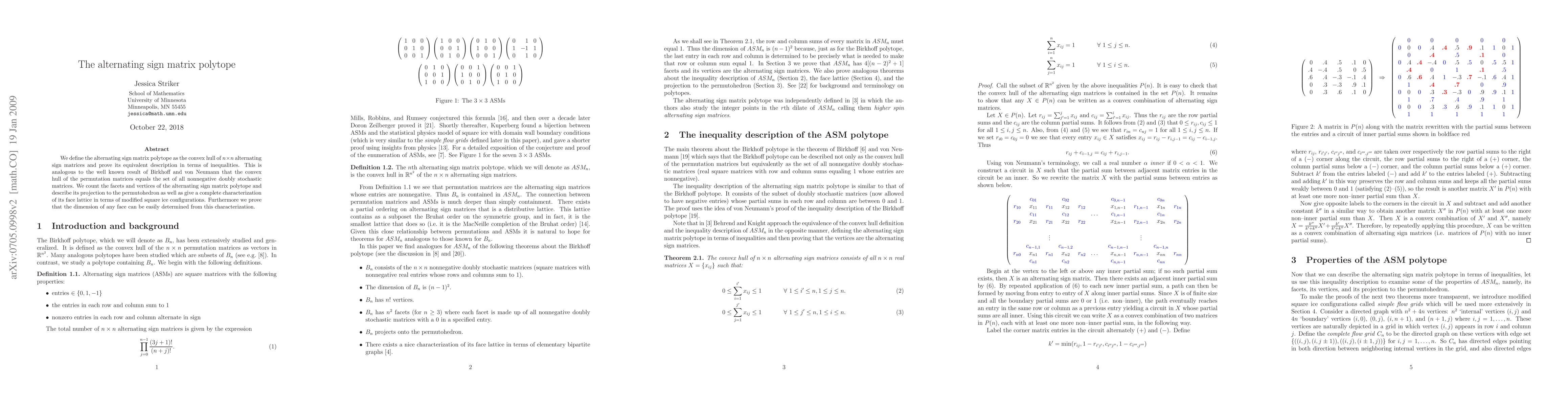 The alternating sign matrix polytope is defined as the convex hull of n x n alternating sign matrices, and its facets and vertices are counted and characterized in terms of modified square ice configurations. The dimension of any face is determined by this characterization.