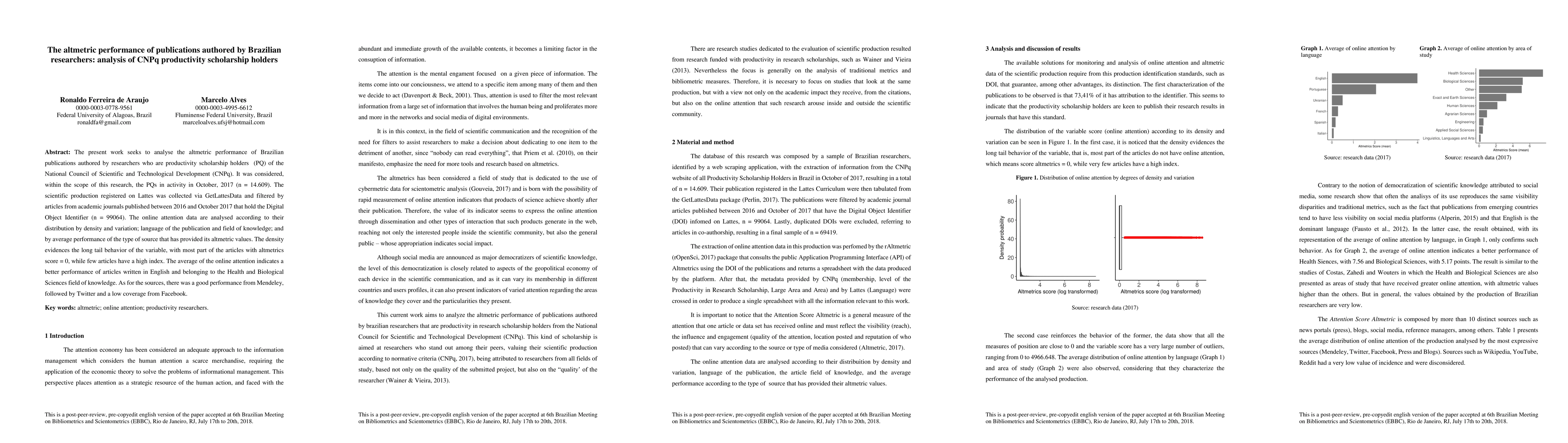 The present work seeks to analyse the altmetric performance of Brazilian publications authored by researchers who are productivity scholarship holders (PQ) of the National Council of Scientific and Technological Development (CNPq). It was considered, within the scope of this research, the PQs in activity in October, 2017 (n = 14.609). The scientific production registered on Lattes was collected via GetLattesData and filtered by articles from academic journals published between 2016 and October 2017 that hold the Digital Object Identifier (n = 99064). The online attention data are analysed according to their distribution by density and variation; language of the publication and field of knowledge; and by average performance of the type of source that has provided its altmetric values. The density evidences the long tail behavior of the variable, with most part of the articles with altmetrics score = 0, while few articles have a high index. The average of the online attention indicates a better performance of articles written in English and belonging to the Health and Biological Sciences field of knowledge. As for the sources, there was a good performance from Mendeley, followed by Twitter and a low coverage from Facebook