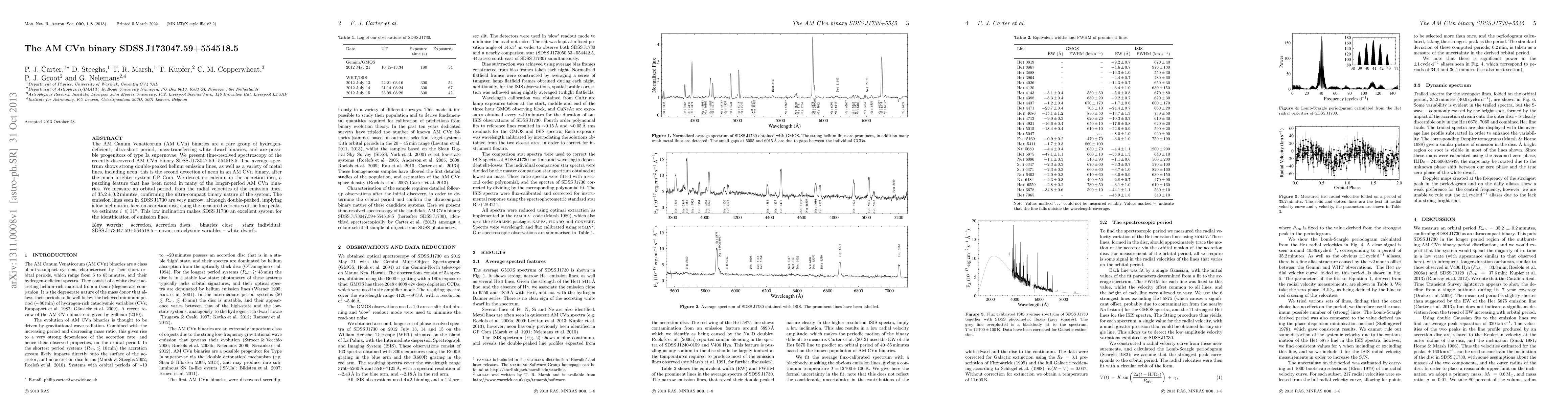 This paper presents time-resolved spectroscopy of the AM CVn binary SDSS J173047.59+554518.5, revealing strong double-peaked helium emission lines and metal lines including neon. The system's orbital period is measured at 35.2 +/- 0.2 minutes, confirming its ultra-compact nature, and the low inclination of its accretion disc is estimated to be less than 11 degrees.