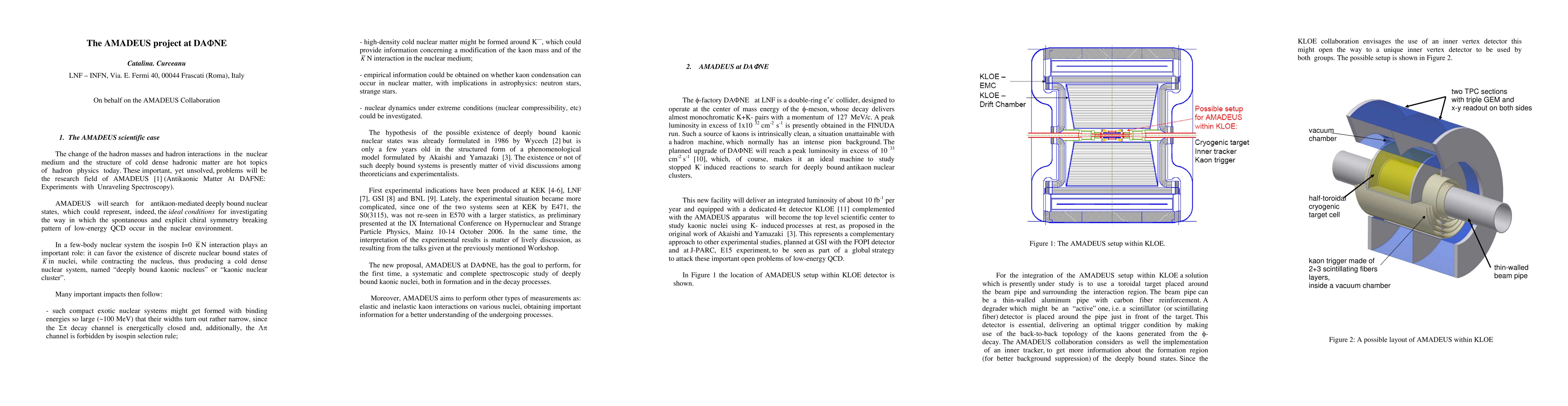 The AMADEUS project at Dafne aims to investigate changes in hadron masses and interactions within nuclear mediums, focusing on the structure of cold dense hadronic matter. It will explore antikaon-mediated nuclear states in helium via K- mesons from the DAFNE accelerator.