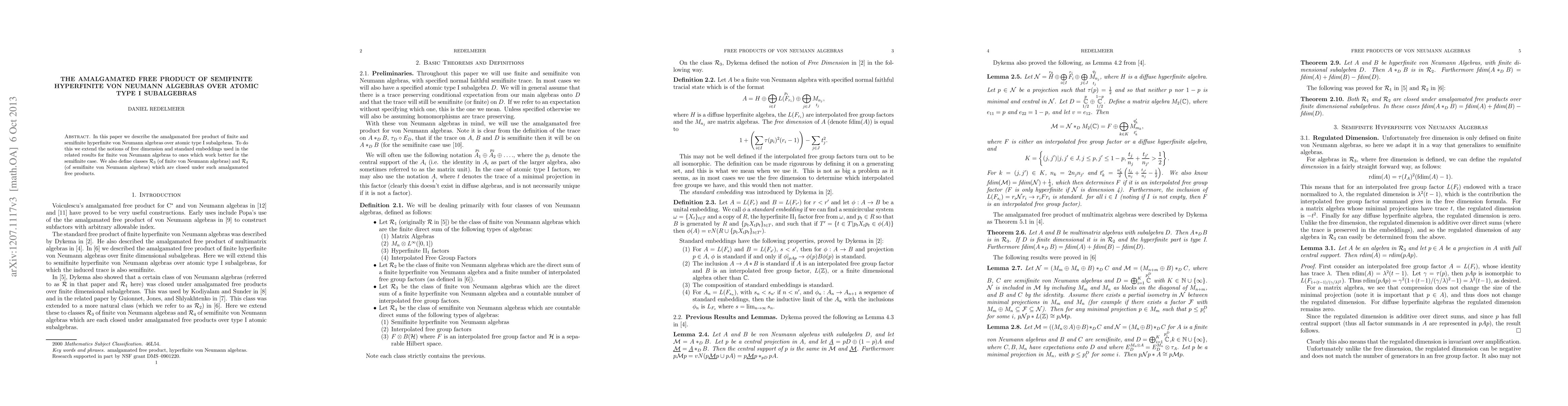 This paper explores the amalgamated free product construction for semifinite hyperfinite von Neumann algebras over atomic type I subalgebras, extending free dimension and standard embedding concepts to better suit semifinite cases. It defines classes R3 and R4, closed under these amalgamated free products.