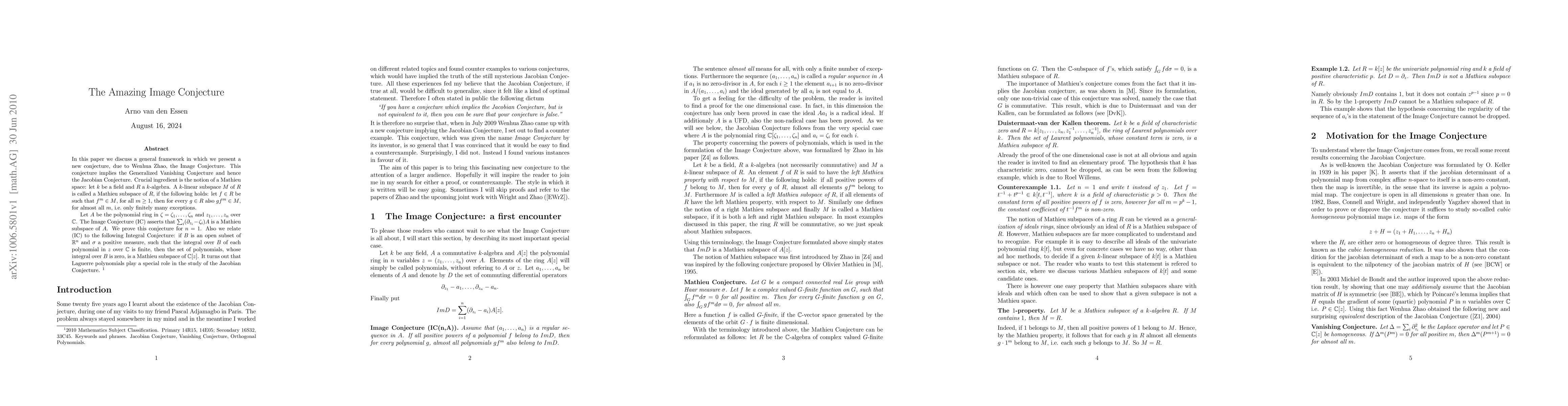In this paper we discuss a general framework in which we present a new conjecture, due to Wenhua Zhao, the Image Conjecture. This conjecture implies the Generalized Vanishing Conjecture and hence the Jacobian Conjecture. Crucial ingredient is the notion of a Mathieu space: let $k$ be a field and $R$ a commutative $k$-algebra. A $k$-linear subspace $M$ of $R$ is called a Mathieu subspace of $R$, if the following holds: let $f\in R$ be such that $f^m\in M$, for all $m\geq 1$, then for every $g\in R$ also $gf^m\in M$, for almost all $m$, i.e. only finitely many exceptions. Let $A$ be the polynomial ring in $\zeta=\zeta_1, ...,\zeta_n$ and $z_1, ...,z_n$ over $\mathbb C$. The Image Conjecture (IC) asserts that $\sum_i(\partial_{z_i}-\zeta_i)A$ is a Mathieu subspace of $A$. We prove this conjecture for $n=1$. Also we relate (IC) to the following Integral Conjecture: if $B$ is an open subset of $\mathbb R^n$ and $\sigma$ a positive measure, such that the integral over $B$ of each polynomial in $z$ over $\mathbb C$ is finite, then the set of polynomials, whose integral over $B$ is zero, is a Mathieu subspace of $\mathbb C[z]$. It turns out that Laguerre polynomials play a special role in the study of the Jacobian Conjecture.