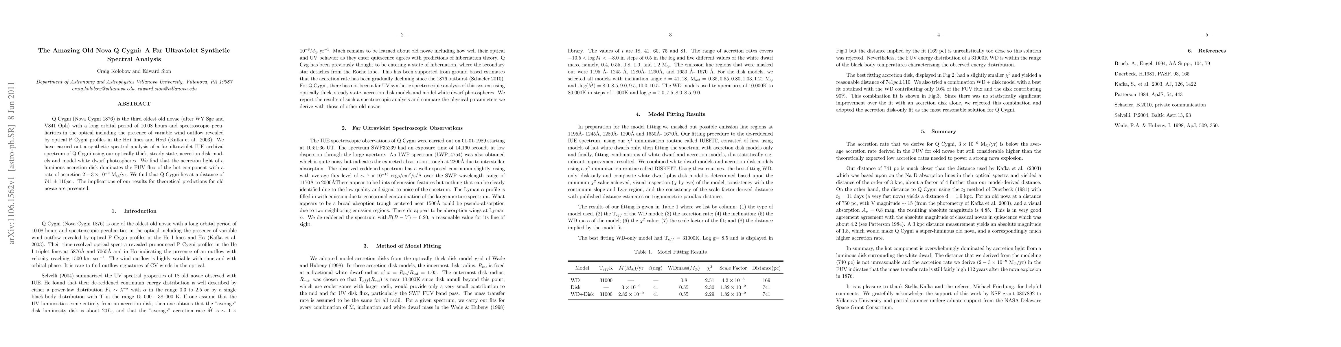 Q Cygni (Nova Cygni 1876) is the third oldest old novae (after WY Sge and V841 Oph) with a long orbital period of 10.08 hours and spectroscopic peculiarities in the optical including the presence of variable wind outflow revealed by optical P Cygni profiles in the HeI lines and H alpha beta (Kafka et al. 2003). We have carried out a synthetic spectral analysis of a far ultraviolet IUE archival spectrum of Q Cygni using our optically thick, steady state, accretion disk models and model white dwarf photospheres. We find that the accretion light of a luminous accretion disk dominates the FUV flux of the hot component with a rate of accretion 2-3 1.E-9 Msun/yr. We find that Q Cygni lies at a distance of 741 \pm 110 pc . The implications of our results for theoretical predictions for old novae are presented.