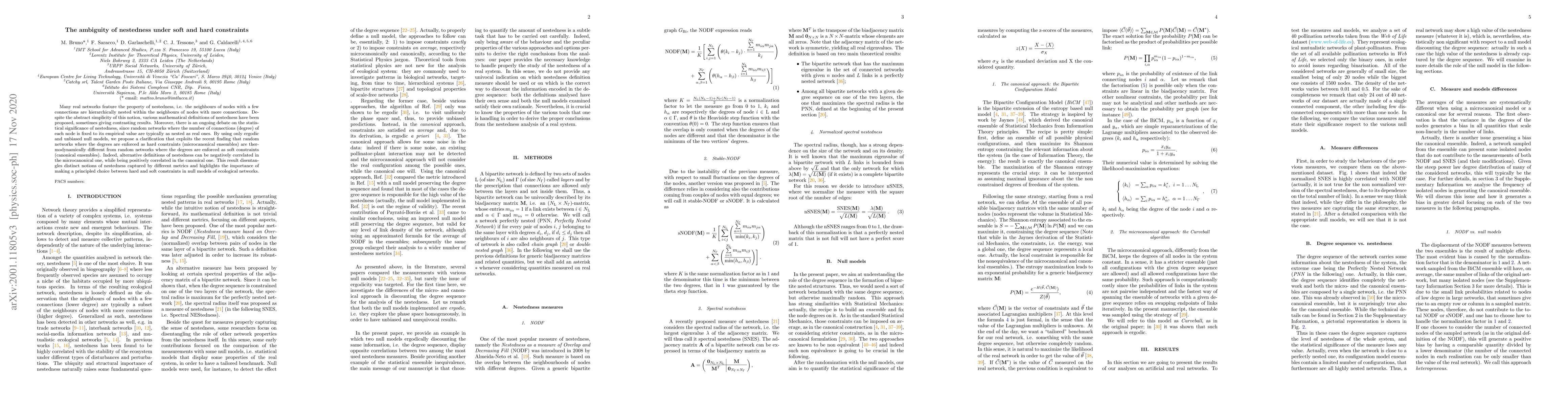 Many real networks feature the property of nestedness, i.e. the neighbours of nodes with a few connections are hierarchically nested within the neighbours of nodes with more connections. Despite the abstract simplicity of this notion, different mathematical definitions of nestedness have been proposed, sometimes giving contrasting results. Moreover, there is an ongoing debate on the statistical significance of nestedness, since even random networks where the number of connections (degree) of each node is fixed to its empirical value are typically as nested as real-world ones. Here we propose a clarification that exploits the recent finding that random networks where the degrees are enforced as hard constraints (microcanonical ensembles) are thermodynamically different from random networks where the degrees are enforced as soft constraints (canonical ensembles). We show that if the real network is perfectly nested, then the two ensembles are trivially equivalent and the observed nestedness, independently of its definition, is indeed an unavoidable consequence of the empirical degrees. On the other hand, if the real network is not perfectly nested, then the two ensembles are not equivalent and alternative definitions of nestedness can be even positively correlated in the canonical ensemble and negatively correlated in the microcanonical one. This result disentangles distinct notions of nestedness captured by different metrics and highlights the importance of making a principled choice between hard and soft constraints in null models of ecological networks.