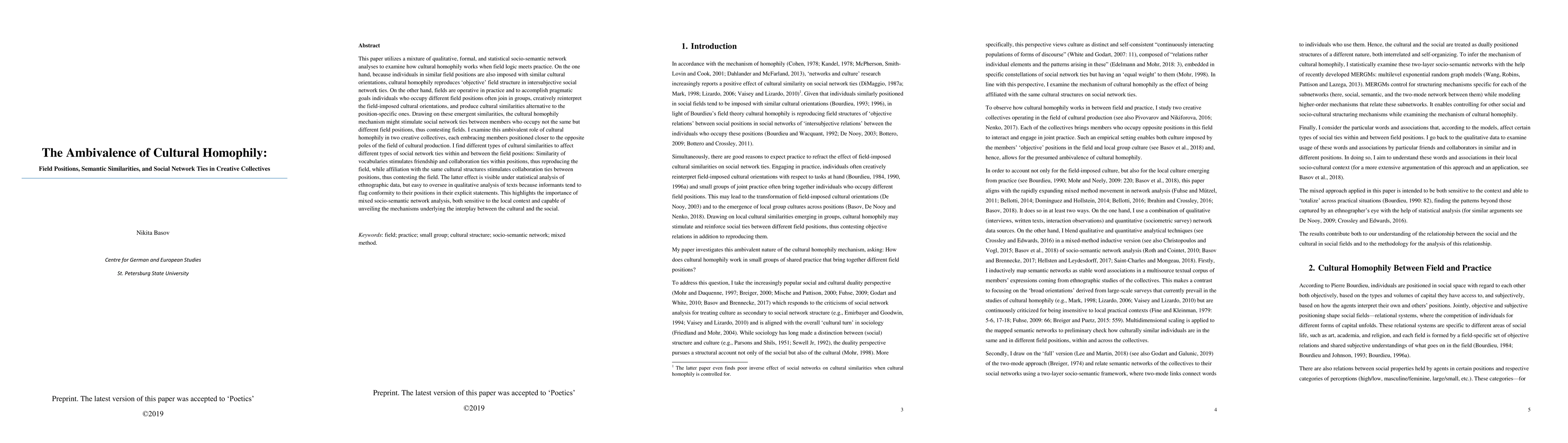 This paper utilizes a mixture of qualitative, formal, and statistical socio-semantic network analyses to examine how cultural homophily works when field logic meets practice. On the one hand, because individuals in similar field positions are also imposed with similar cultural orientations, cultural homophily reproduces objective field structure in intersubjective social network ties. On the other hand, fields are operative in practice and to accomplish pragmatic goals individuals who occupy different field positions often join in groups, creatively reinterpret the field-imposed cultural orientations, and produce cultural similarities alternative to the position-specific ones. Drawing on these emergent similarities, the cultural homophily mechanism might stimulate social network ties between members who occupy not the same but different field positions, thus contesting fields. I examine this ambivalent role of cultural homophily in two creative collectives, each embracing members positioned closer to the opposite poles of the field of cultural production. I find different types of cultural similarities to affect different types of social network ties within and between the field positions: Similarity of vocabularies stimulates friendship and collaboration ties within positions, thus reproducing the field, while affiliation with the same cultural structures stimulates collaboration ties between positions, thus contesting the field. The latter effect is visible under statistical analysis of ethnographic data, but easy to oversee in qualitative analysis of texts because informants tend to flag conformity to their positions in their explicit statements. This highlights the importance of mixed socio-semantic network analysis, both sensitive to the local context and capable of unveiling the mechanisms underlying the interplay between the cultural and the social.