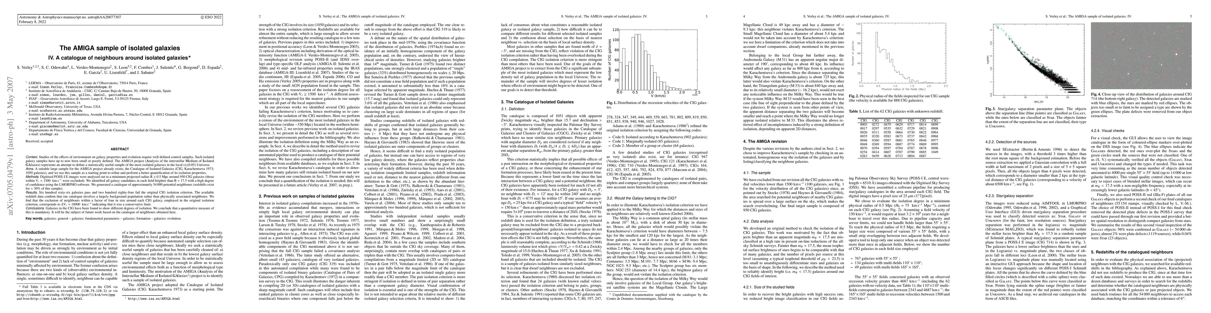 Studies of the effects of environment on galaxy properties and evolution require well defined control samples. Such isolated galaxy samples have up to now been small or poorly defined. The AMIGA project (Analysis of the interstellar Medium of Isolated GAlaxies) represents an attempt to define a statistically useful sample of the most isolated galaxies in the local (z < 0.05) Universe. A suitable large sample for the AMIGA project already exists, the Catalogue of Isolated Galaxies (CIG, Karachentseva 1973; 1050 galaxies), and we use this sample as a starting point to refine and perform a better quantification of its isolation properties. Digitised POSS-I E images were analysed out to a minimum projected radius R > 0.5 Mpc around 950 CIG galaxies (those within Vr = 1500 km s-1 were excluded). We identified all galaxy candidates in each field brighter than B = 17.5 with a high degree of confidence using the LMORPHO software. We generated a catalogue of approximately 54 000 potential neighbours (redshifts exist for 30% of this sample). Six hundred sixty-six galaxies pass and two hundred eighty-four fail the original CIG isolation criterion. The available redshift data confirm that our catalogue involves a largely background population rather than physically associated neighbours. We find that the exclusion of neighbours within a factor of four in size around each CIG galaxy, employed in the original isolation criterion, corresponds to Delta Vr ~ 18000 km s-1 indicating that it was a conservative limit. Galaxies in the CIG have been found to show different degrees of isolation. We conclude that a quantitative measure of this is mandatory. It will be the subject of future work based on the catalogue of neighbours obtained here.