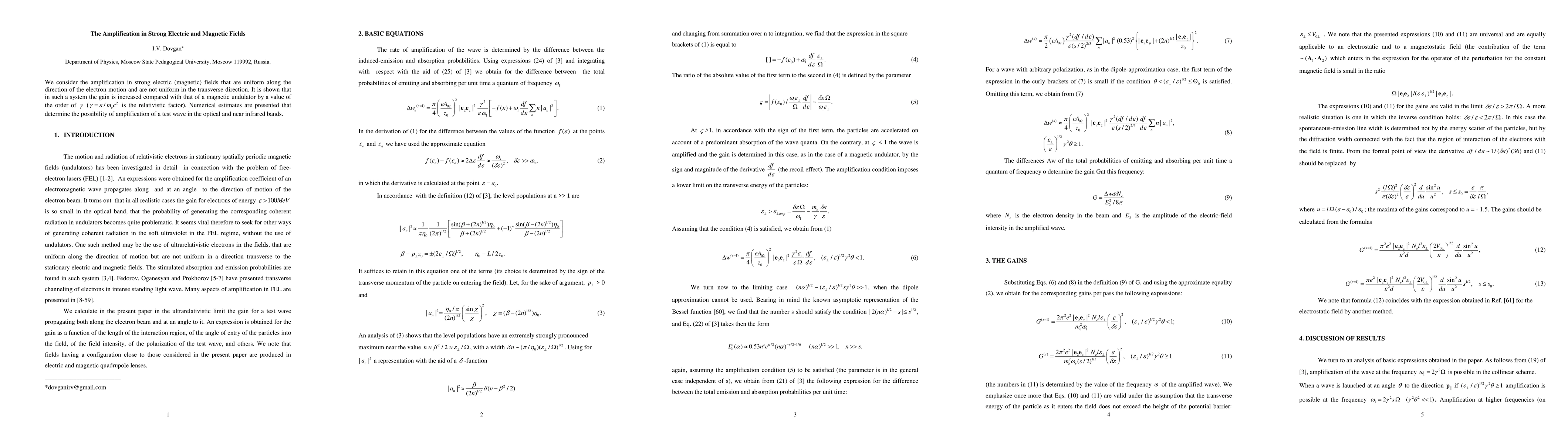 Researchers found that strong electric and magnetic fields can amplify a test wave by a factor of gamma, increasing gain compared to a magnetic undulator. This could lead to amplification in optical and near-infrared bands.