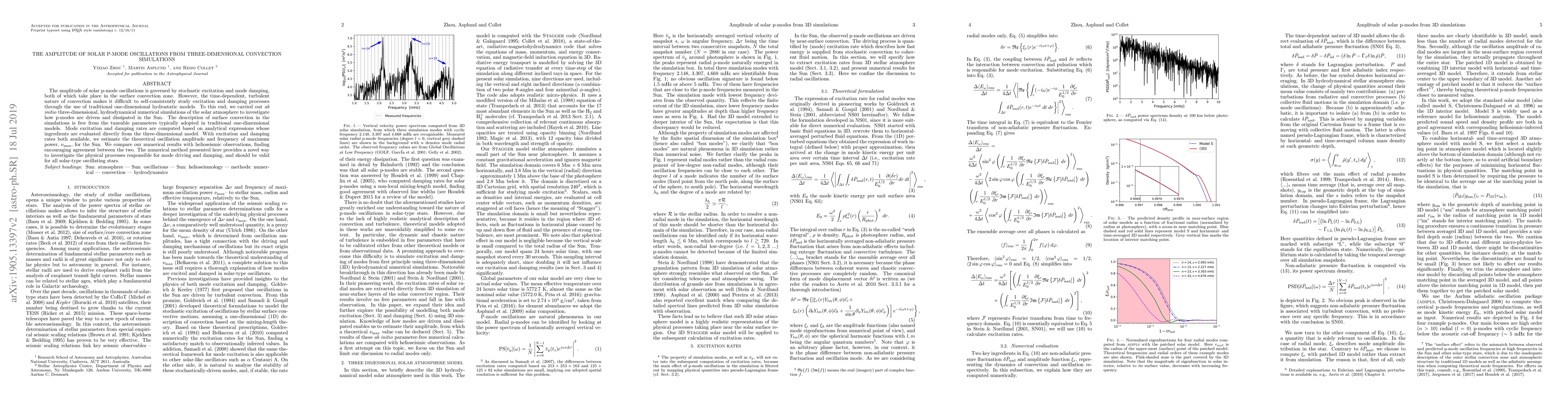 This paper investigates the amplitude of solar p-mode oscillations using three-dimensional hydrodynamic simulations to model the Sun's convection zone. The study finds good agreement between theoretical predictions and helioseismic observations, offering a new method to understand mode excitation and damping in solar-type stars.