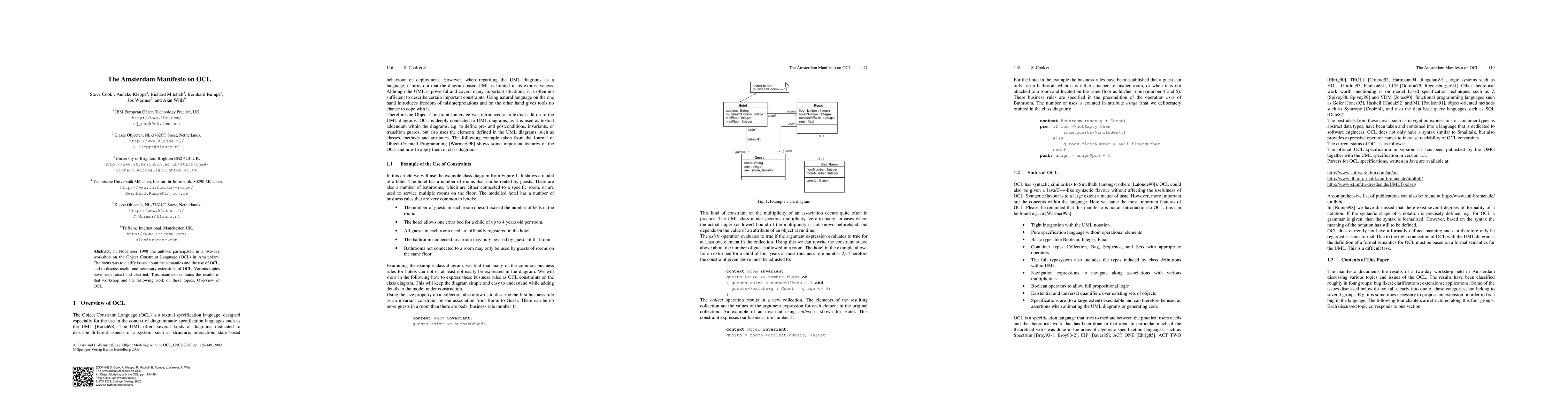 The Amsterdam Manifesto on OCL summarizes the outcomes of a 1998 workshop aimed at clarifying the semantics and usage of the Object Constraint Language (OCL) and discussing potential extensions. It presents the collective insights and decisions made regarding the language's future development.