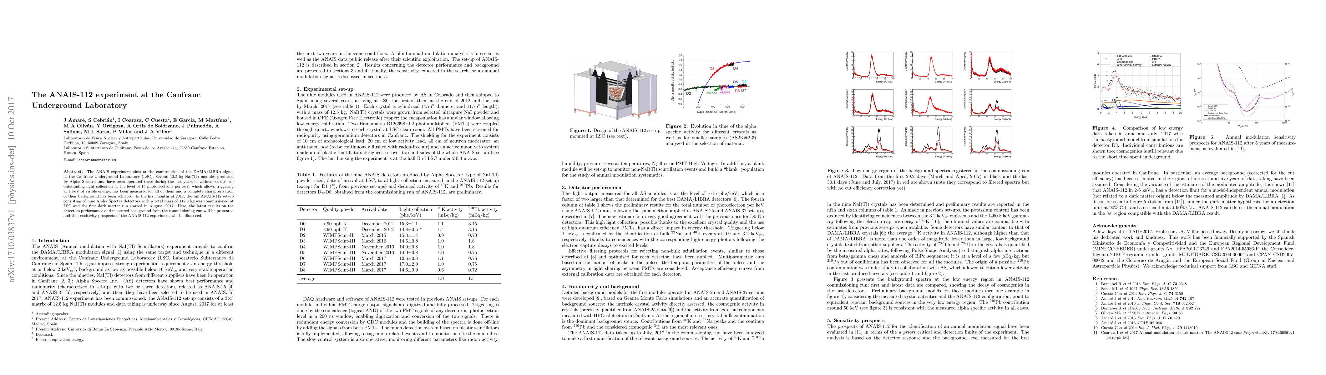 The ANAIS experiment aims at the confirmation of the DAMA/LIBRA signal at the Canfranc Underground Laboratory (LSC). Several 12.5 kg NaI(Tl) modules produced by Alpha Spectra Inc. have been operated there during the last years in various set-ups; an outstanding light collection at the level of 15 photoelectrons per keV, which allows triggering at 1 keV of visible energy, has been measured for all of them and a complete characterization of their background has been achieved. In the first months of 2017, the full ANAIS-112 set-up consisting of nine Alpha Spectra detectors with a total mass of 112.5 kg was commissioned at LSC and the first dark matter run started in August, 2017. Here, the latest results on the detectors performance and measured background from the commissioning run will be presented and the sensitivity prospects of the ANAIS-112 experiment will be discussed.