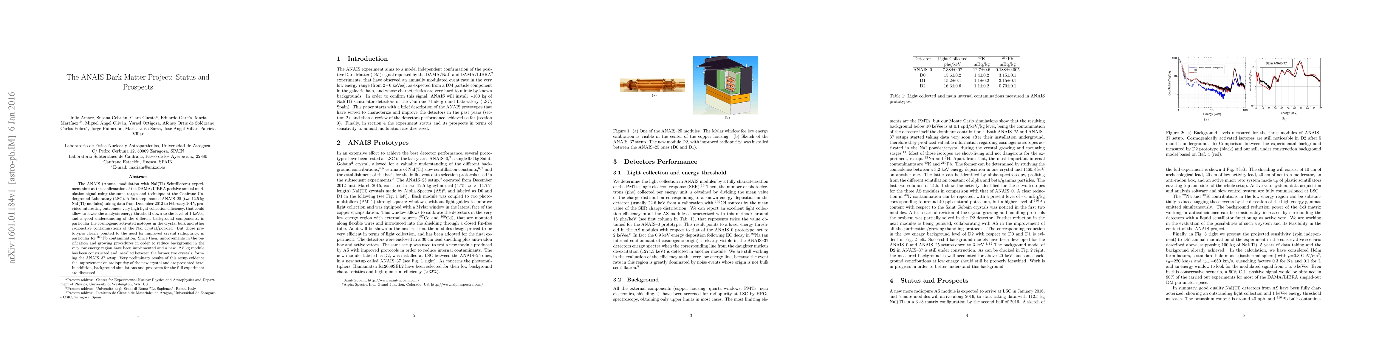 The ANAIS (Annual modulation with NaI(Tl) Scintillators) experiment aims at the confirmation of the DAMA/LIBRA positive annual modulation signal using the same target and technique at the Canfranc Underground Laboratory (LSC). A first step, named ANAIS-25 (two 12.5 kg NaI(Tl) modules) taking data from December 2012 to February 2015, provided interesting outcomes: very high light collection efficiency, that could allow to lower the analysis energy threshold down to the level of 1 keVee, and a good understanding of the different background components, in particular the cosmogenic activated isotopes in the crystal bulk and other radioactive contaminations of the NaI crystal/powder. But those prototypes clearly pointed to the need for improved crystal radiopurity, in particular for $^{210}$Pb contamination. Since then, improvements in the purification and growing procedures in order to reduce background in the very low energy region have been implemented and a new 12.5 kg module has been constructed and installed between the former two crystals, forming the ANAIS-37 setup. Very preliminary results of this setup evidence the improvement on radiopurity of the new crystal and are presented here. In addition, background simulations and prospects for the full experiment are discussed.