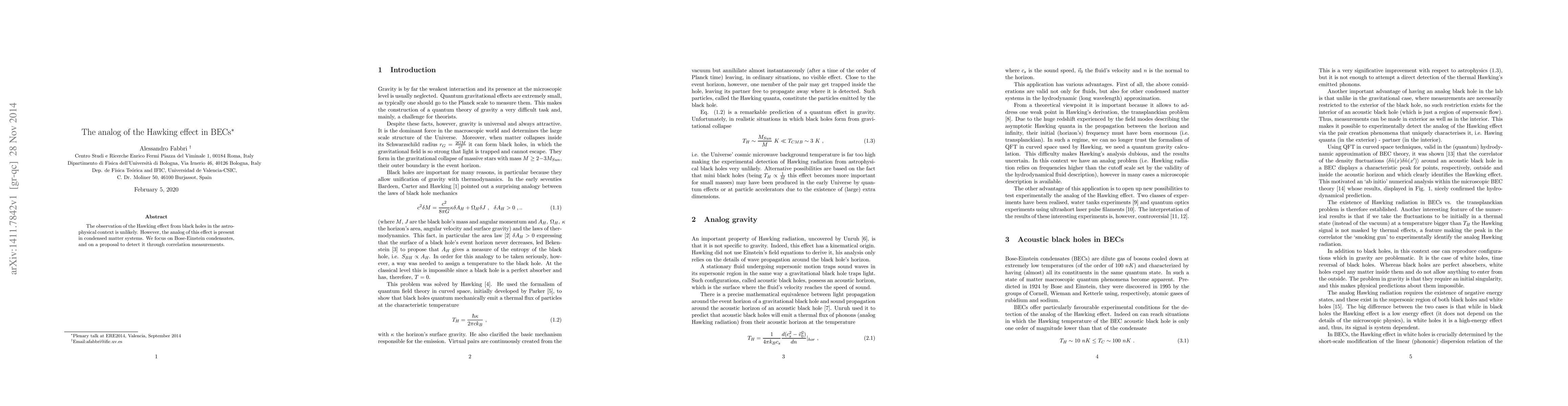 The observation of the Hawking effect from black holes in the astrophysical context is unlikely. However, the analog of this effect is present in condensed matter systems. We focus on Bose-Einstein condensates, and on a proposal to detect it through correlation measurements.