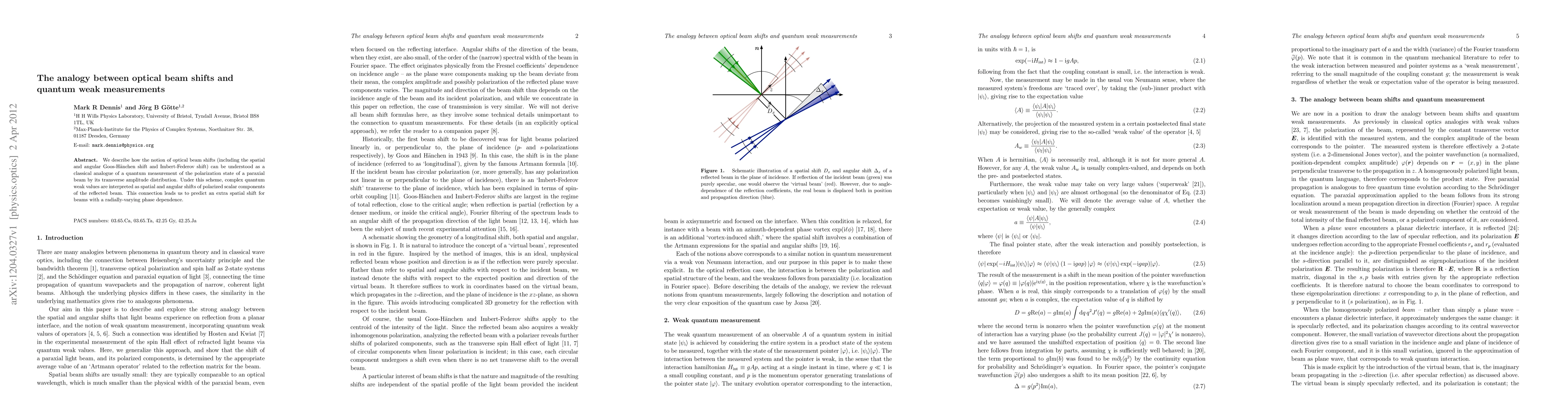 The paper establishes an analogy between optical beam shifts and quantum weak measurements, utilizing classical optics to interpret quantum phenomena. It describes shifts such as Goos-Hänchen and Imbert-Federov shifts in terms of complex quantum weak values of polarized scalar components of reflected beams.