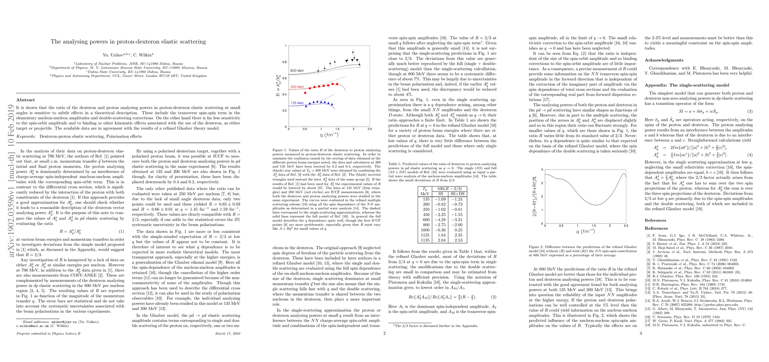 This paper investigates the ratio of deuteron and proton analysing powers in proton-deuteron elastic scattering, highlighting its sensitivity to the transverse spin-spin term and double-scattering corrections, while showing minimal sensitivity to spin-orbit amplitude and deuteron binding effects. The findings align with a refined Glauber theory model.